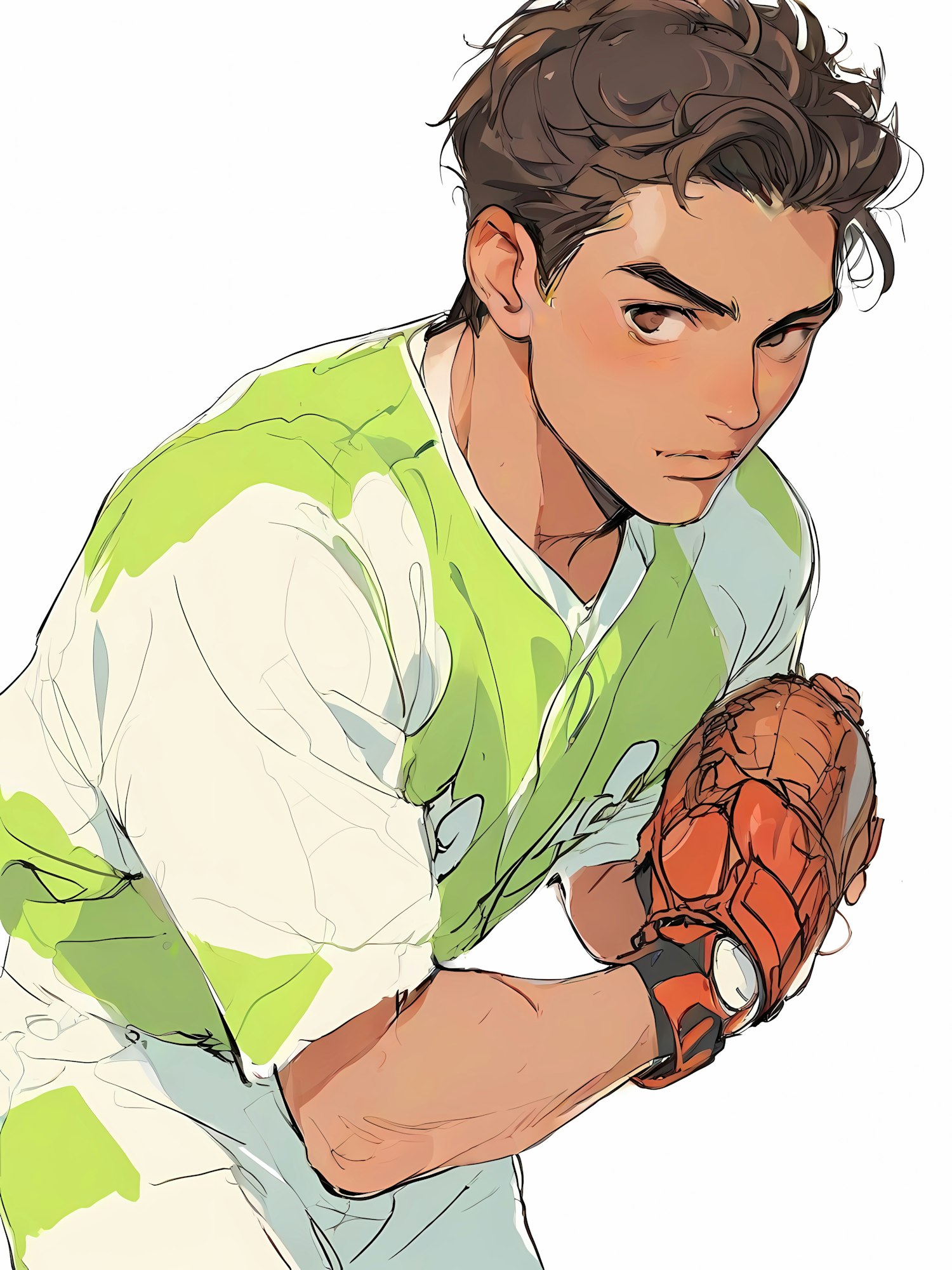 Dynamic illustration of a young baseball player mid-pitch, wearing a white and green uniform with a detailed brown glove.