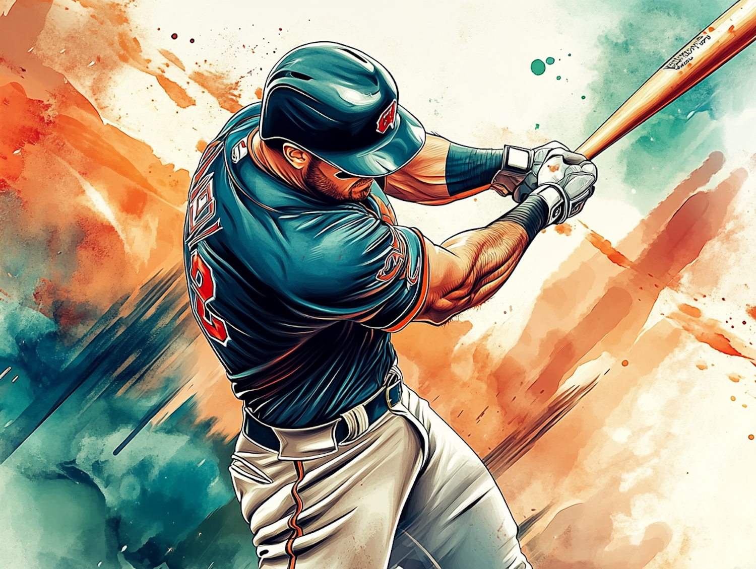 Vivid illustration of a baseball player mid-swing, wearing a teal jersey and white pants, set against a dynamic abstract background.