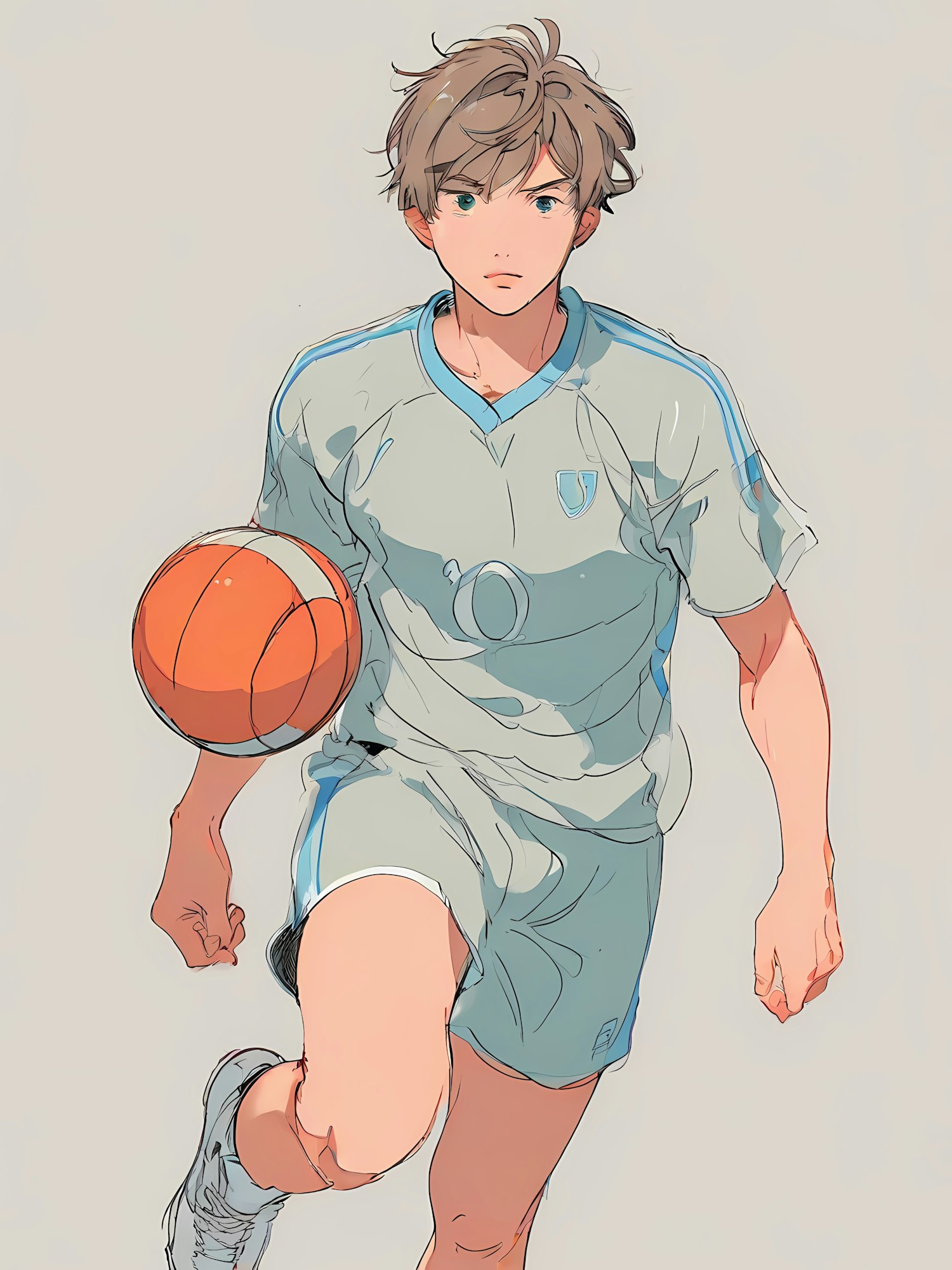 Dynamic illustration of a young athlete with brown hair and green eyes, holding a basketball in motion, wearing a light blue sports uniform.