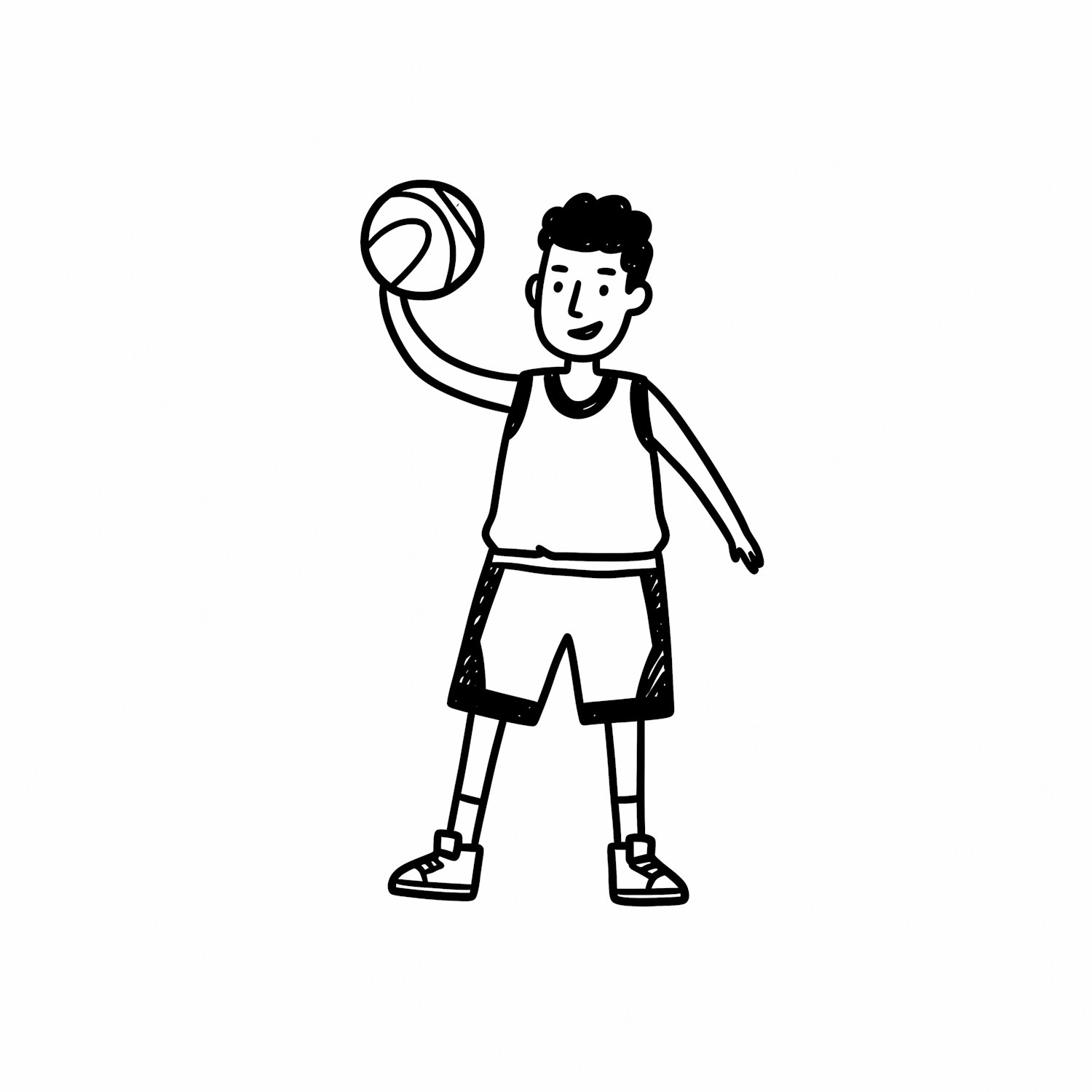 A playful black-and-white cartoon of a young basketball player holding a ball, wearing a jersey and shorts, with a cheerful expression.