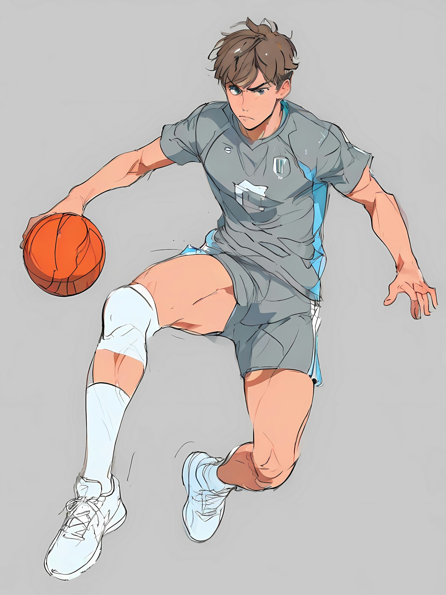 Energetic illustration of a basketball player mid-dribble, wearing a gray uniform with blue accents and a knee brace, showcasing intense focus.