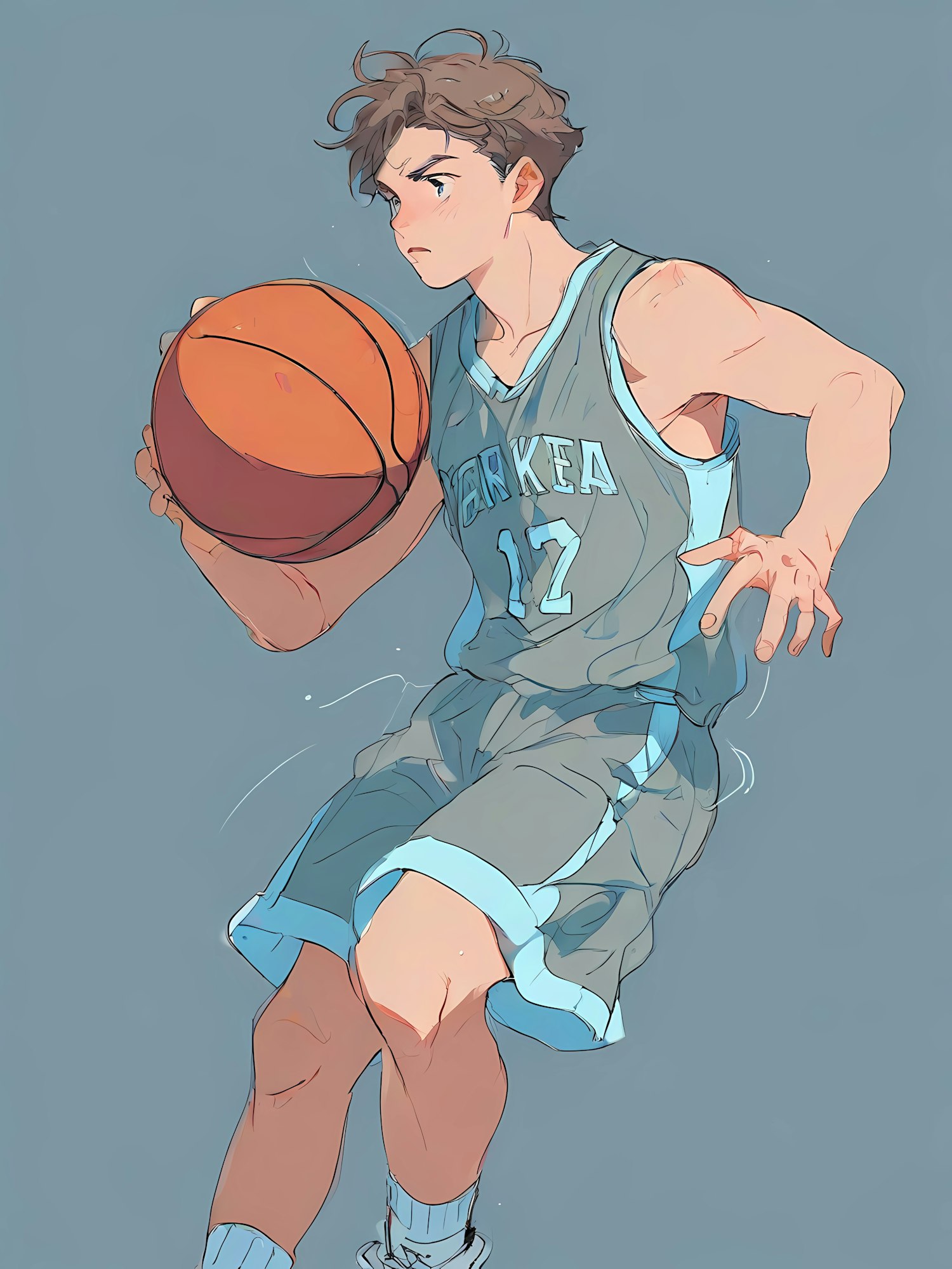 Illustration of a focused basketball player dribbling in a light blue jersey, set against a muted blue background.