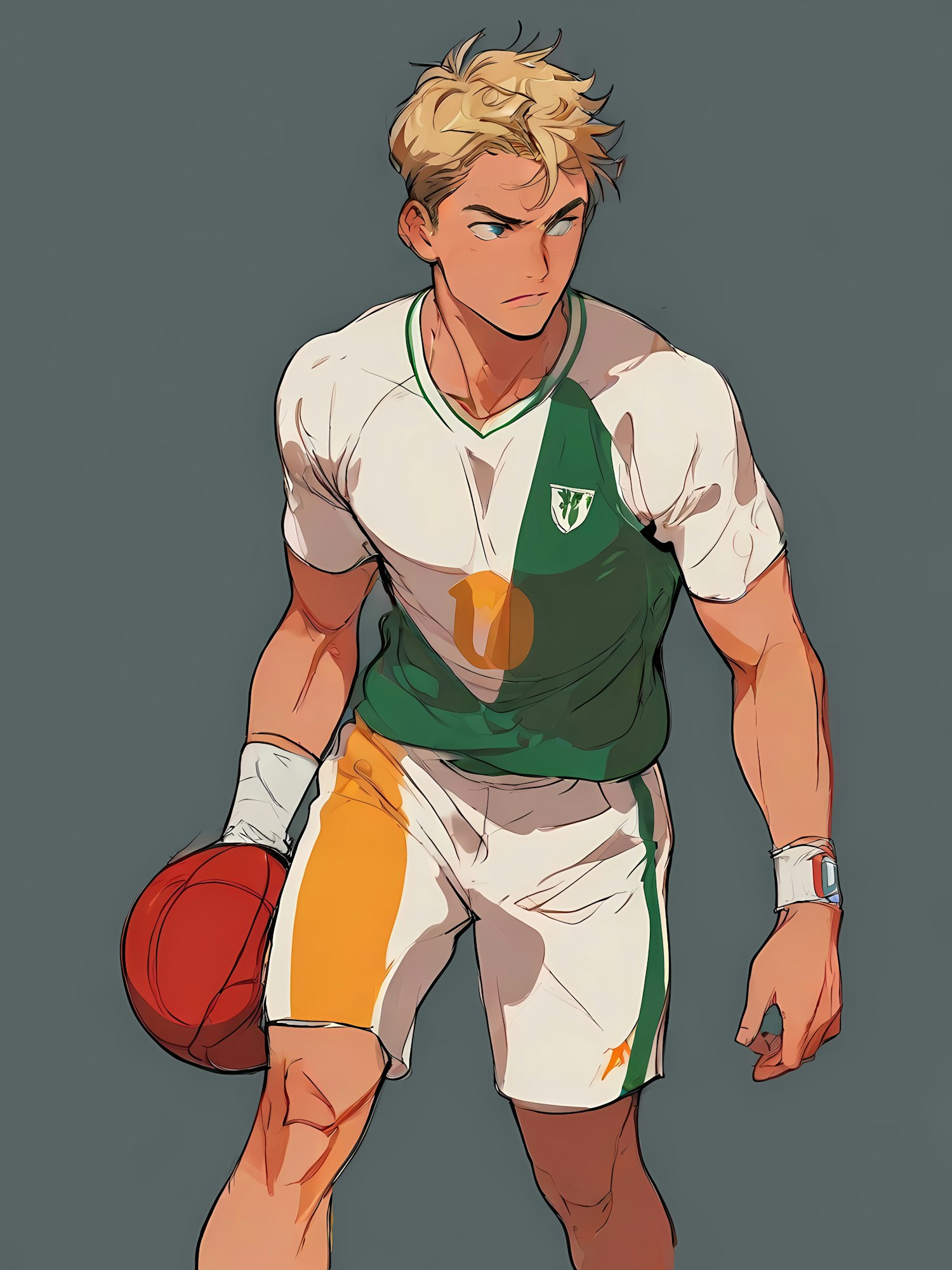 Illustration of a blonde basketball player in a green and white jersey holding a red ball, exuding focus and determination.