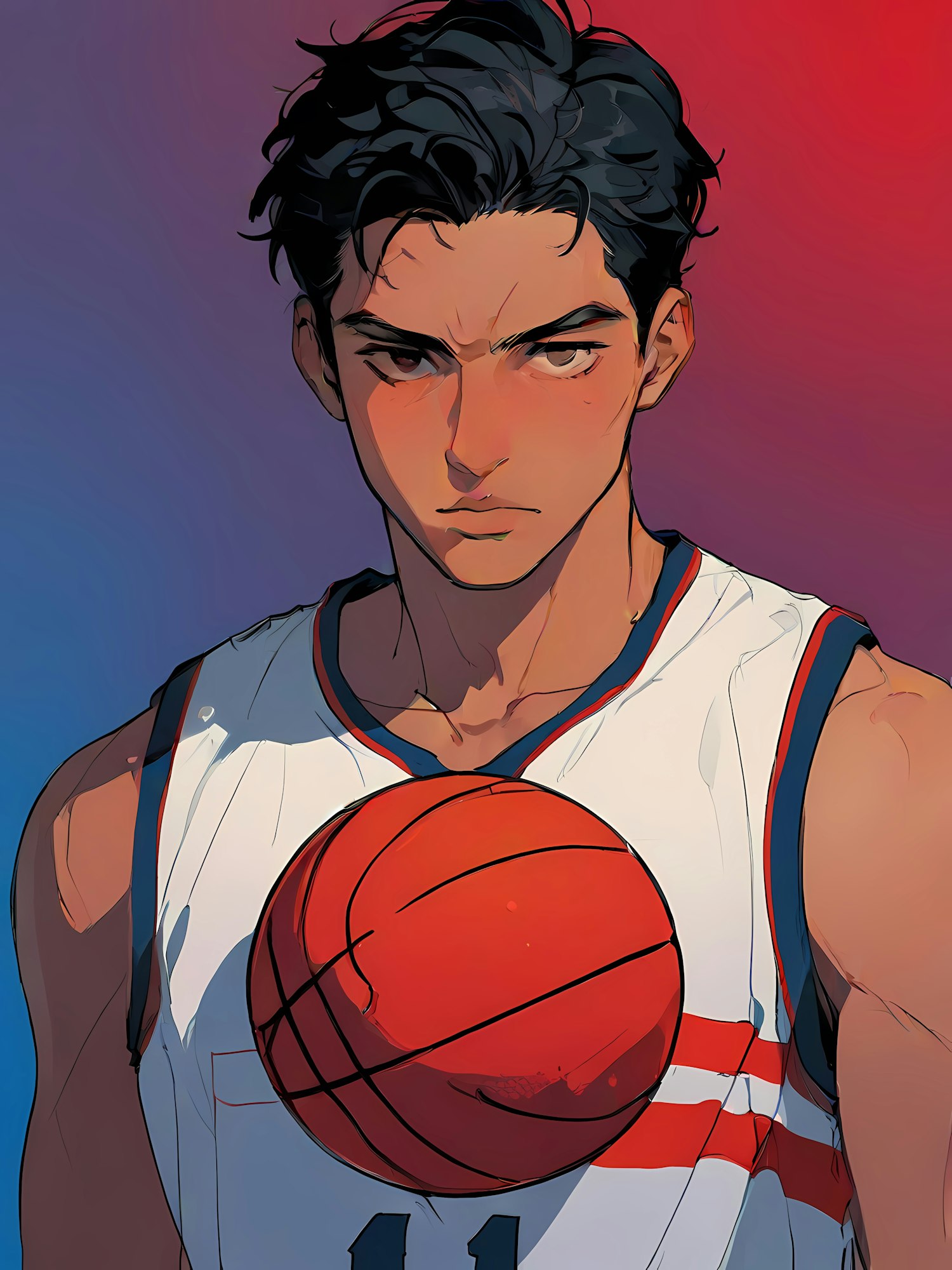 Illustration of a focused basketball player holding a ball, set against a striking red and blue gradient background.