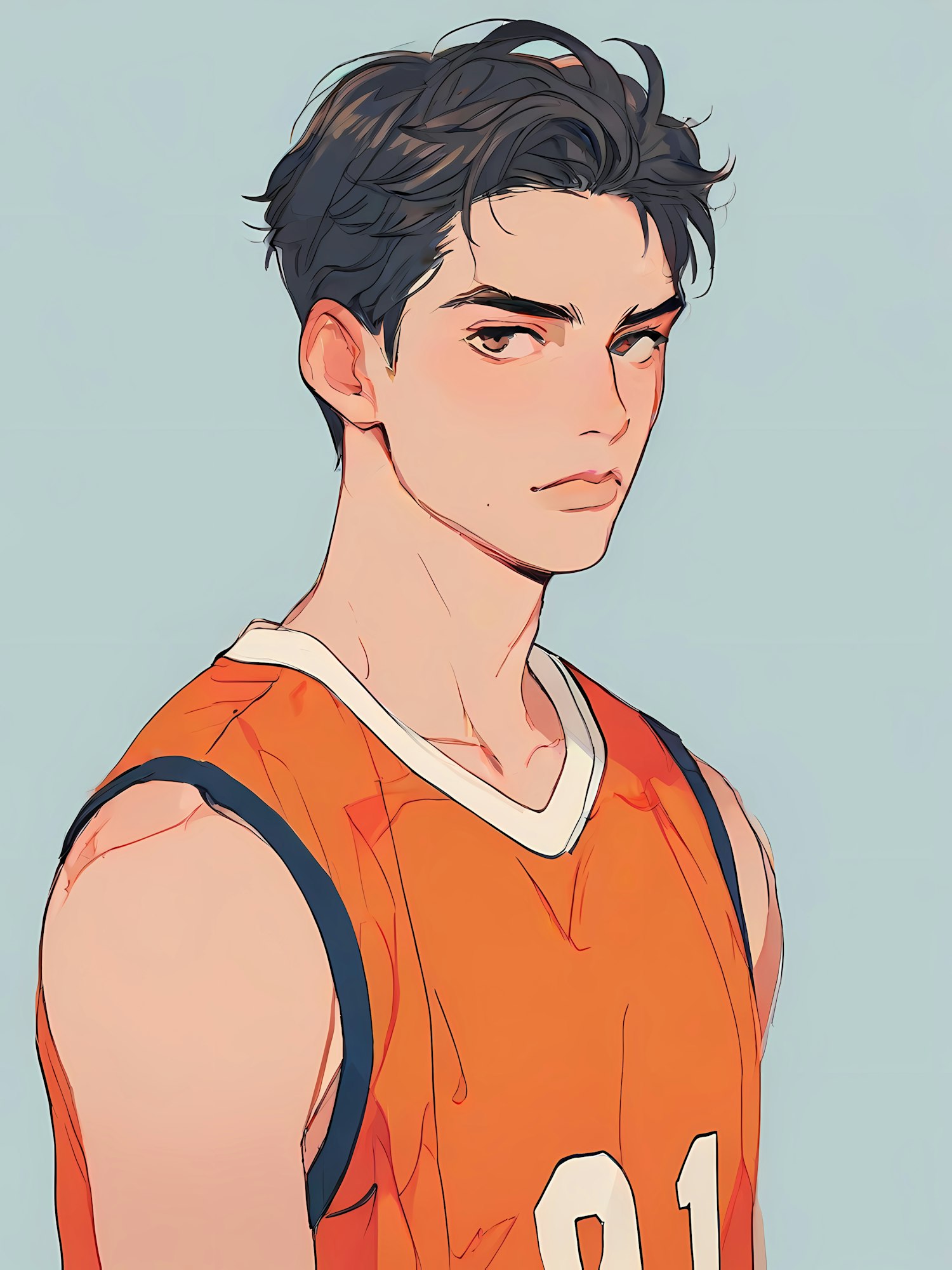 Stylized illustration of a young man in an orange basketball jersey with a serious expression and tousled dark hair against a light blue background.
