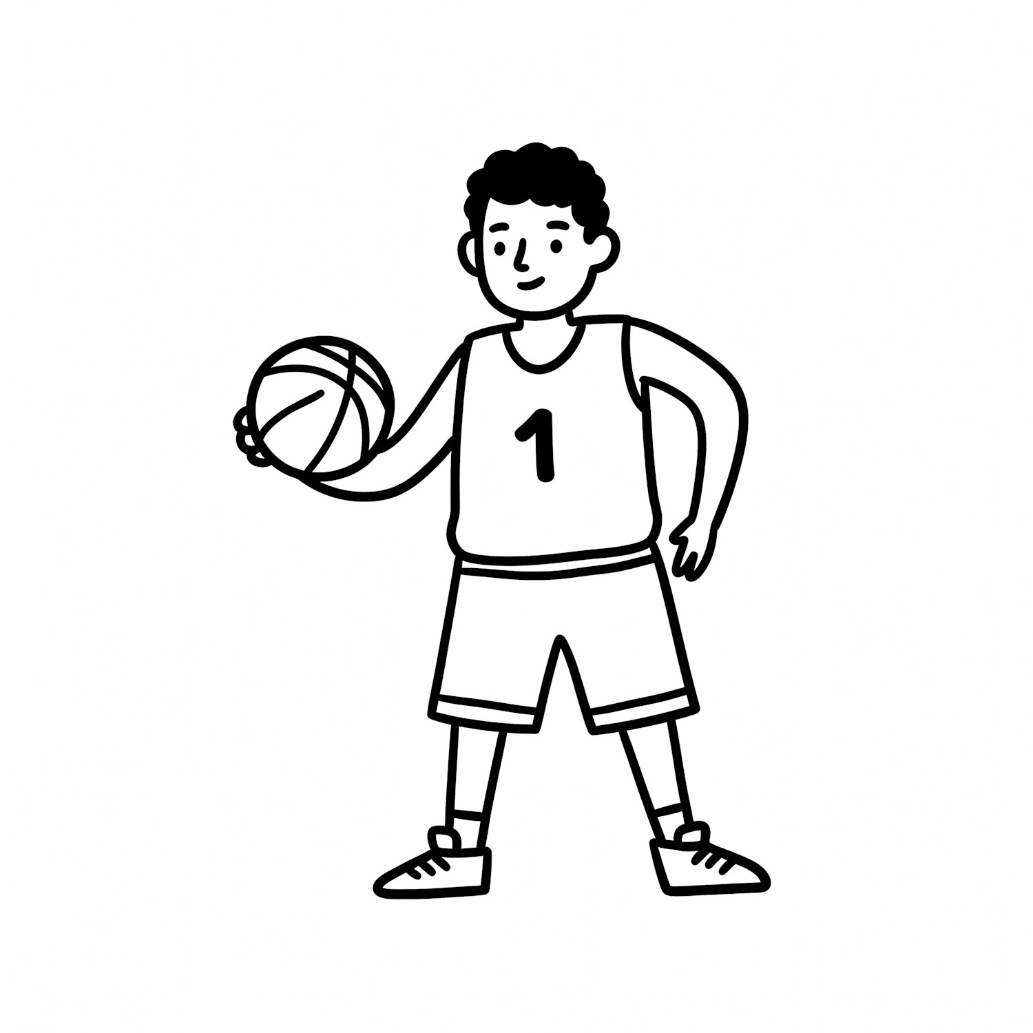 A cartoon-style black-and-white illustration of a basketball player holding a ball, wearing a jersey with the number '1'.