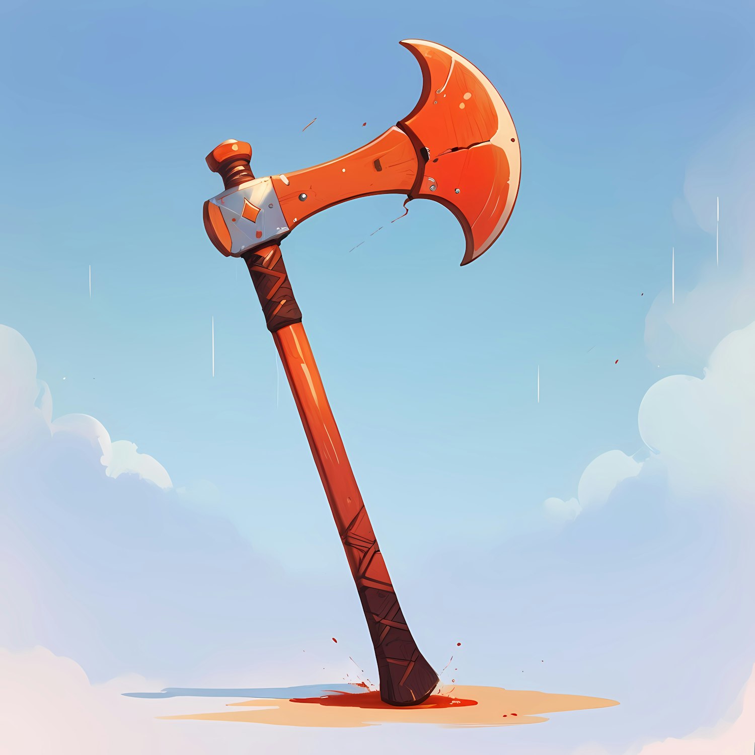 Stylized battle axe with a bloodied blade embedded in the ground, set against a bright sky with soft clouds. Intricate and dramatic design.