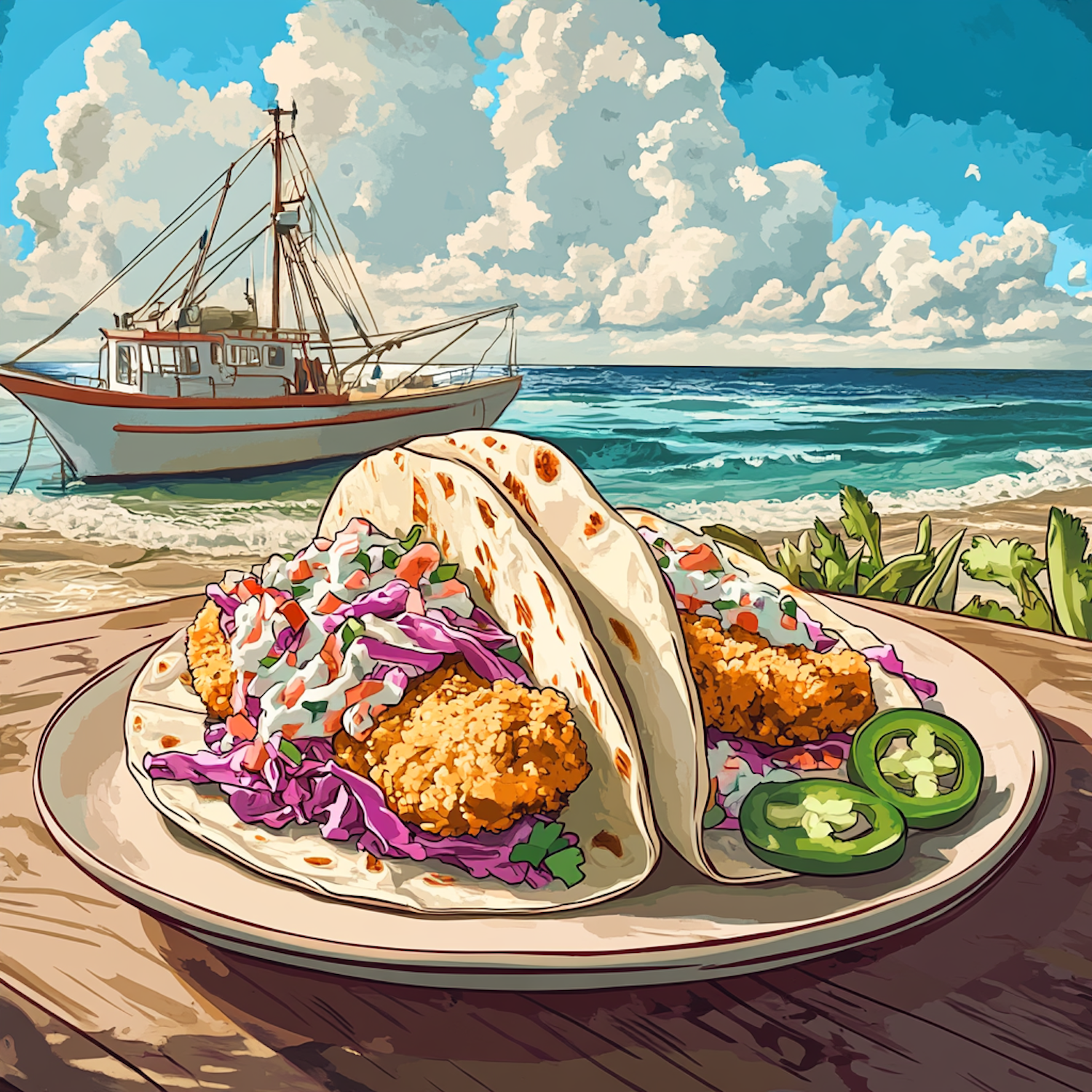 Illustration of fish tacos on a beachside table with a fishing boat and ocean waves in the background.