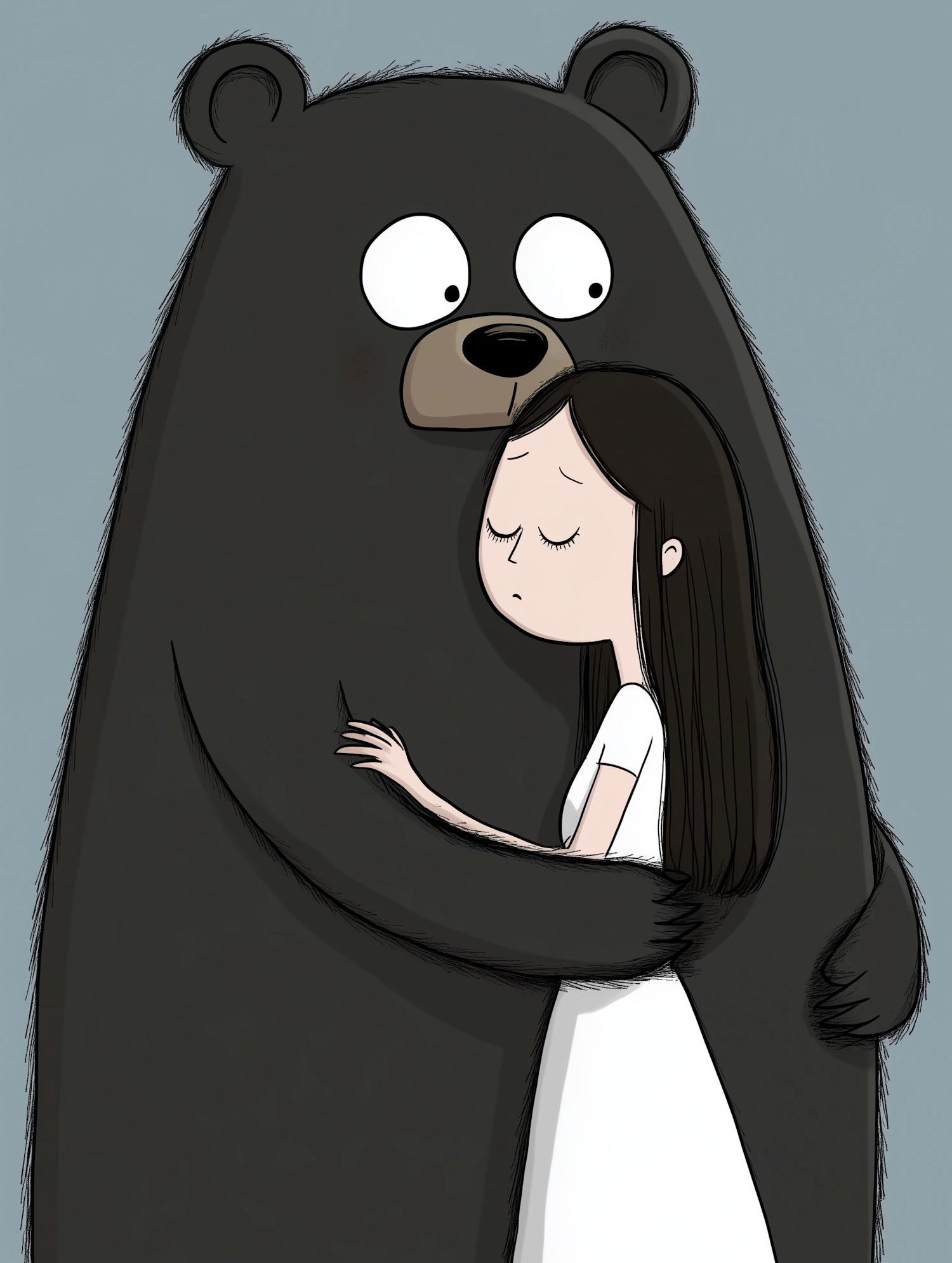 A gentle cartoon bear hugs a serene girl in a white dress, creating a heartwarming scene of friendship and trust.