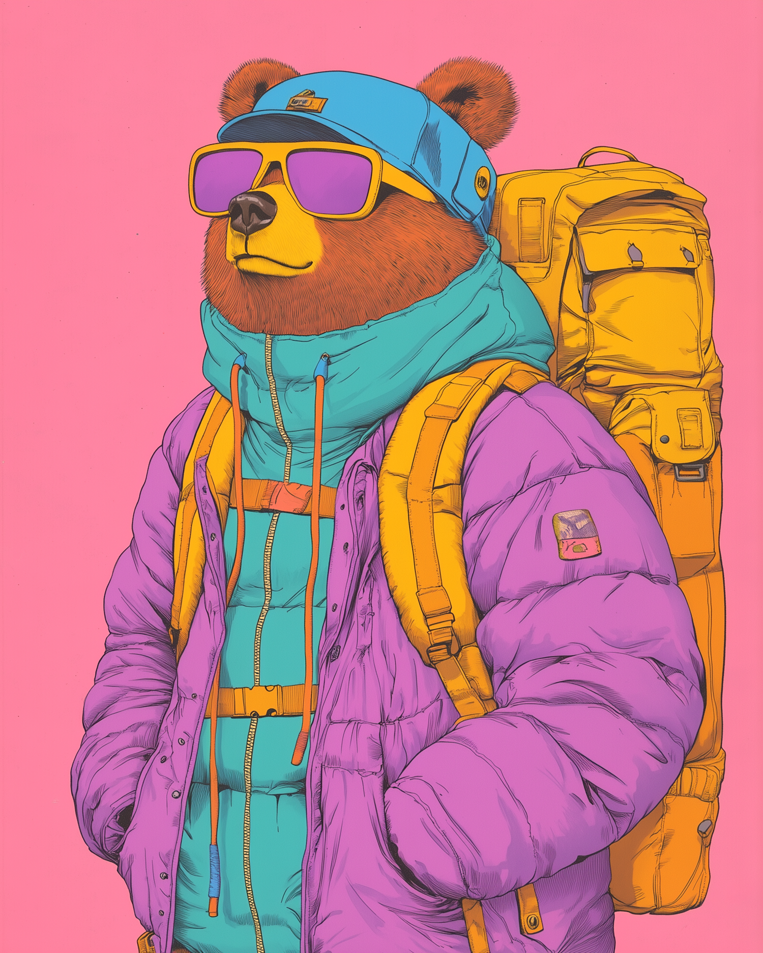 Trendy bear in colorful attire with sunglasses and backpack against a pink background, exuding adventure and style.