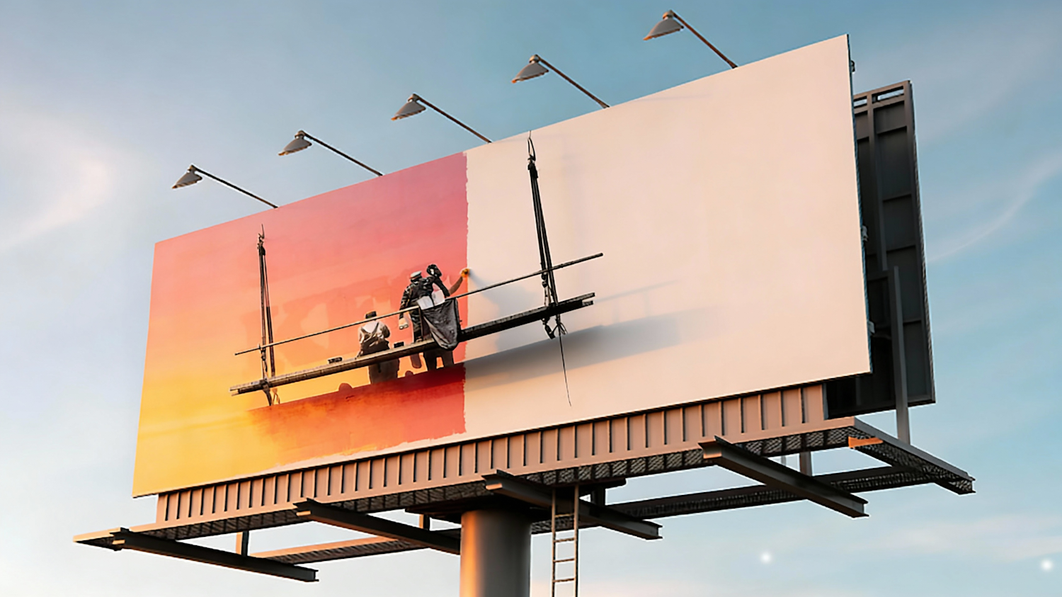 Two workers paint a large billboard with a gradient background, suspended on a platform against a clear blue sky.