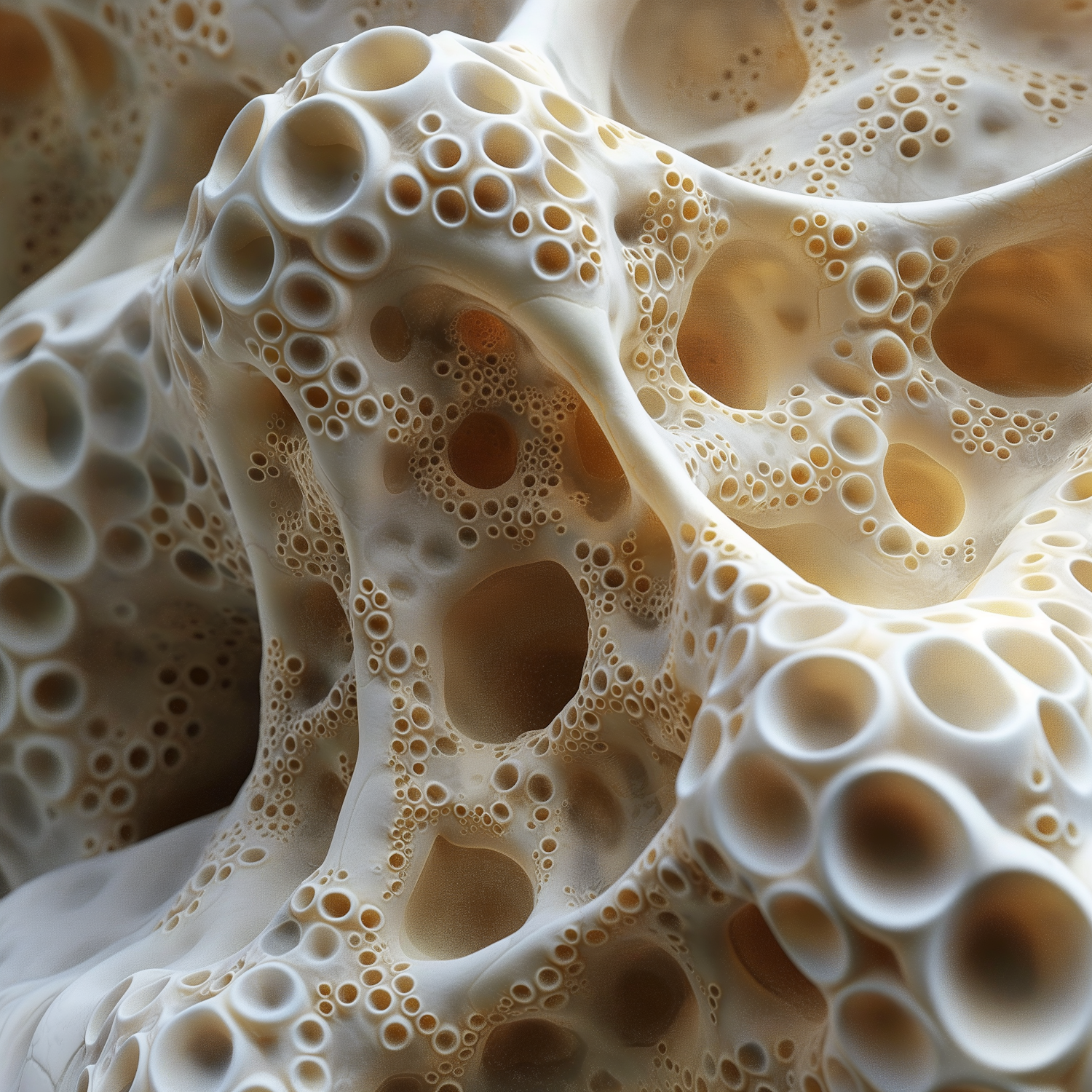 Abstract close-up of a porous, creamy surface with circular holes, creating a complex, organic pattern in beige and cream tones.