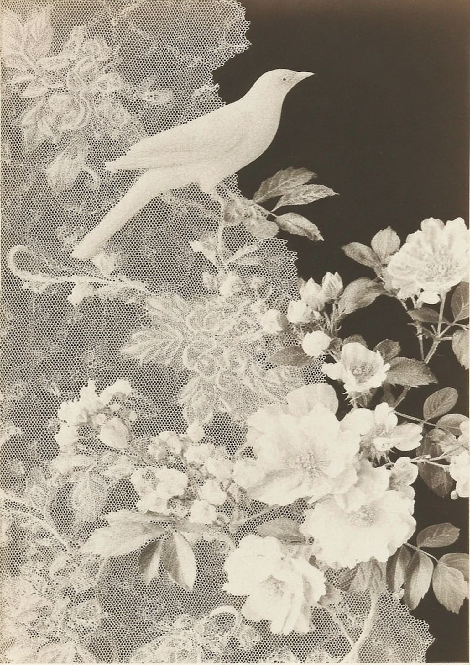 A vintage-style illustration of a bird amidst intricate floral patterns, featuring a monochromatic palette and lace-like textures.