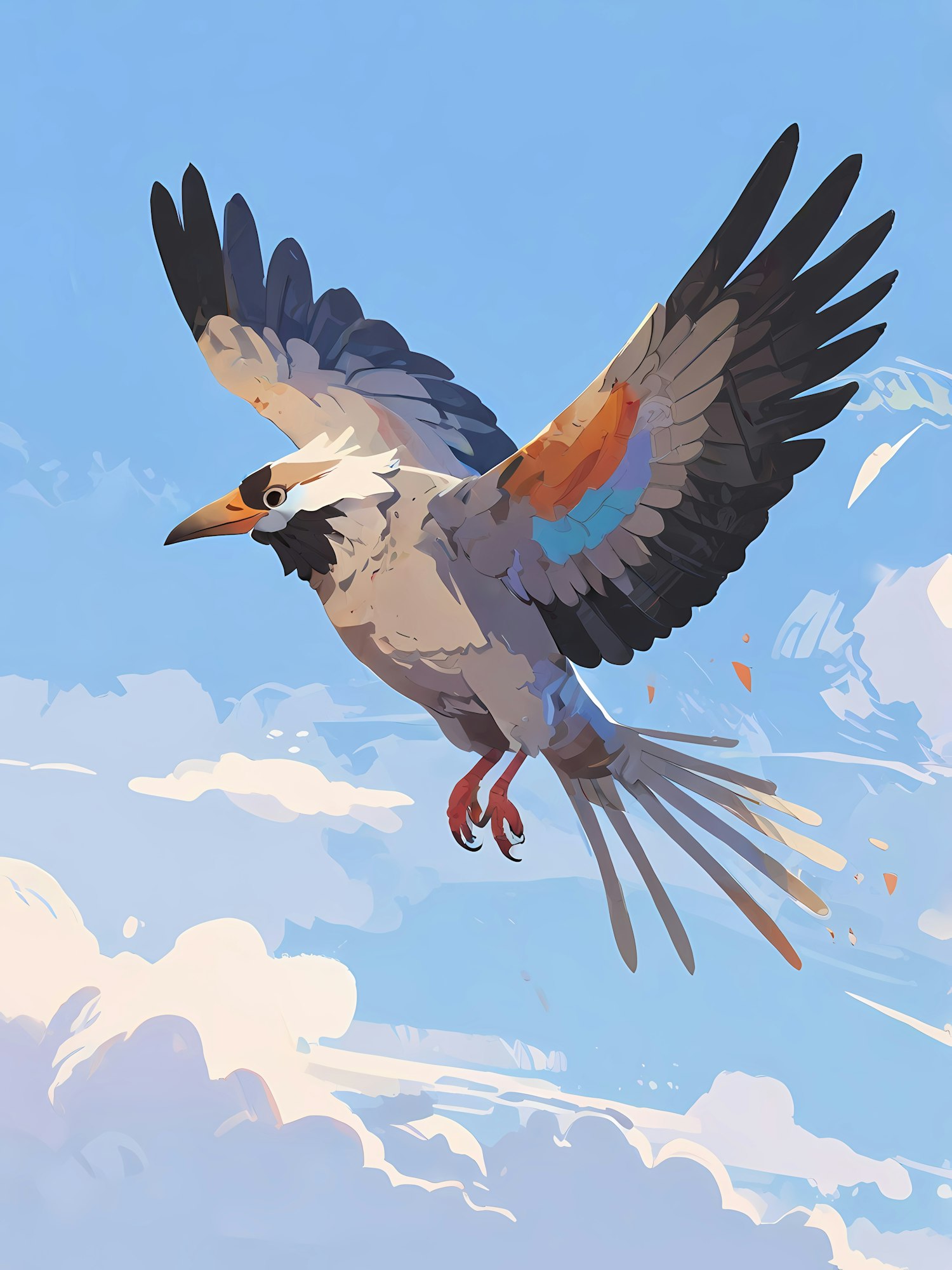 A colorful bird with orange, blue, and black feathers soars gracefully in a bright blue sky with fluffy clouds.