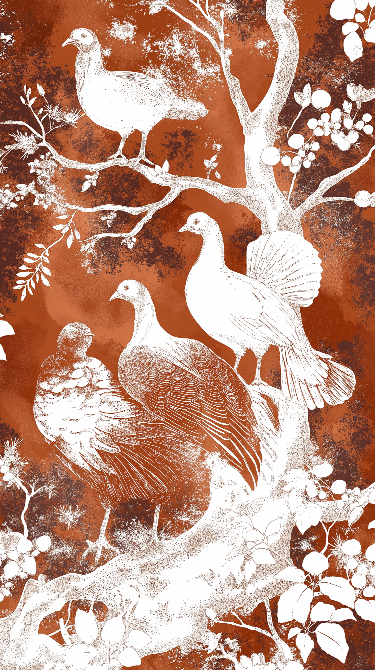 Intricate white line art of birds on a tree branch against a textured brown background, highlighting nature's elegance.