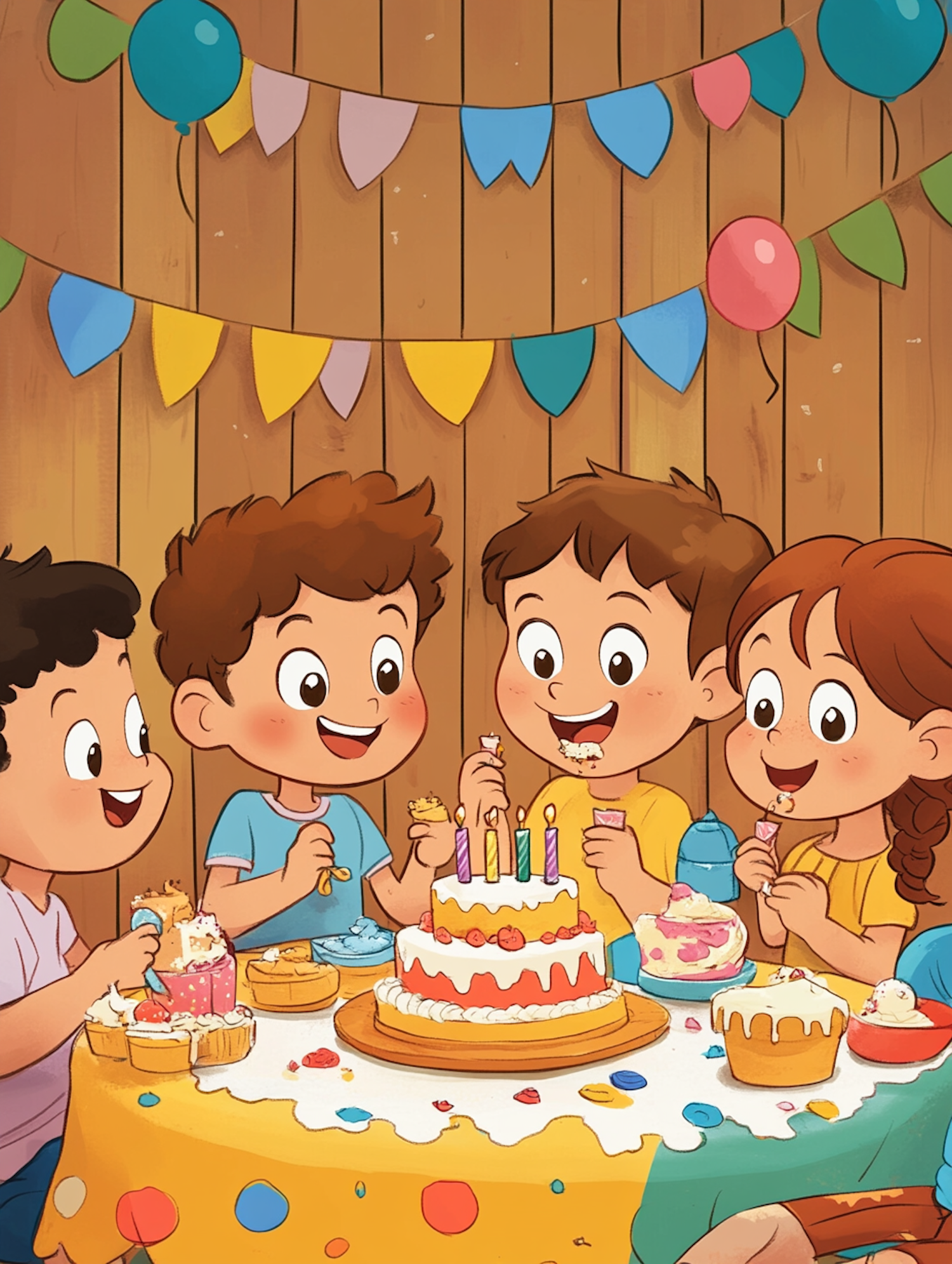Children celebrating a birthday with cake and decorations, featuring colorful balloons and bunting in a festive setting.