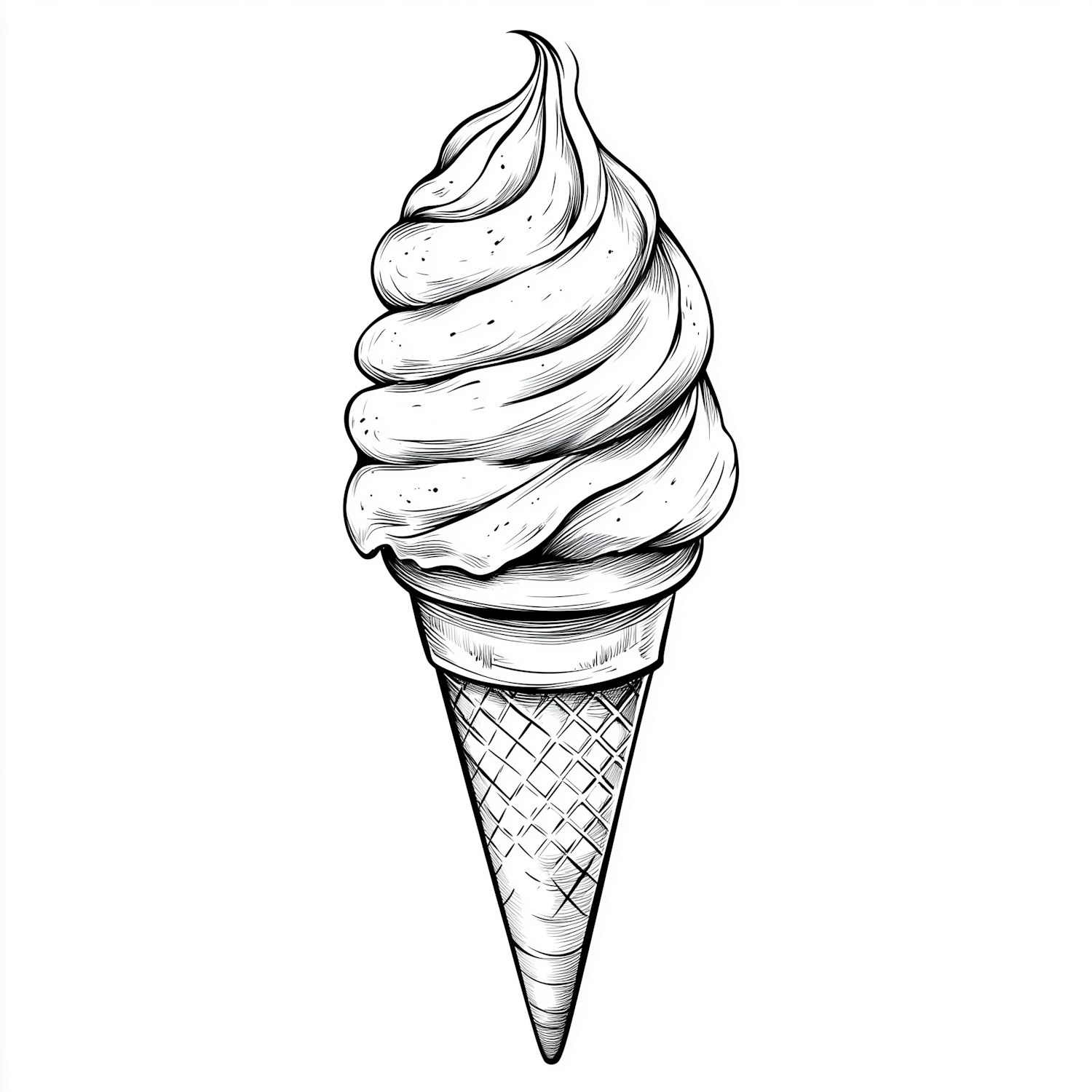 Detailed black-and-white illustration of a soft-serve ice cream cone with a waffle cone and intricate linework on a plain white background.