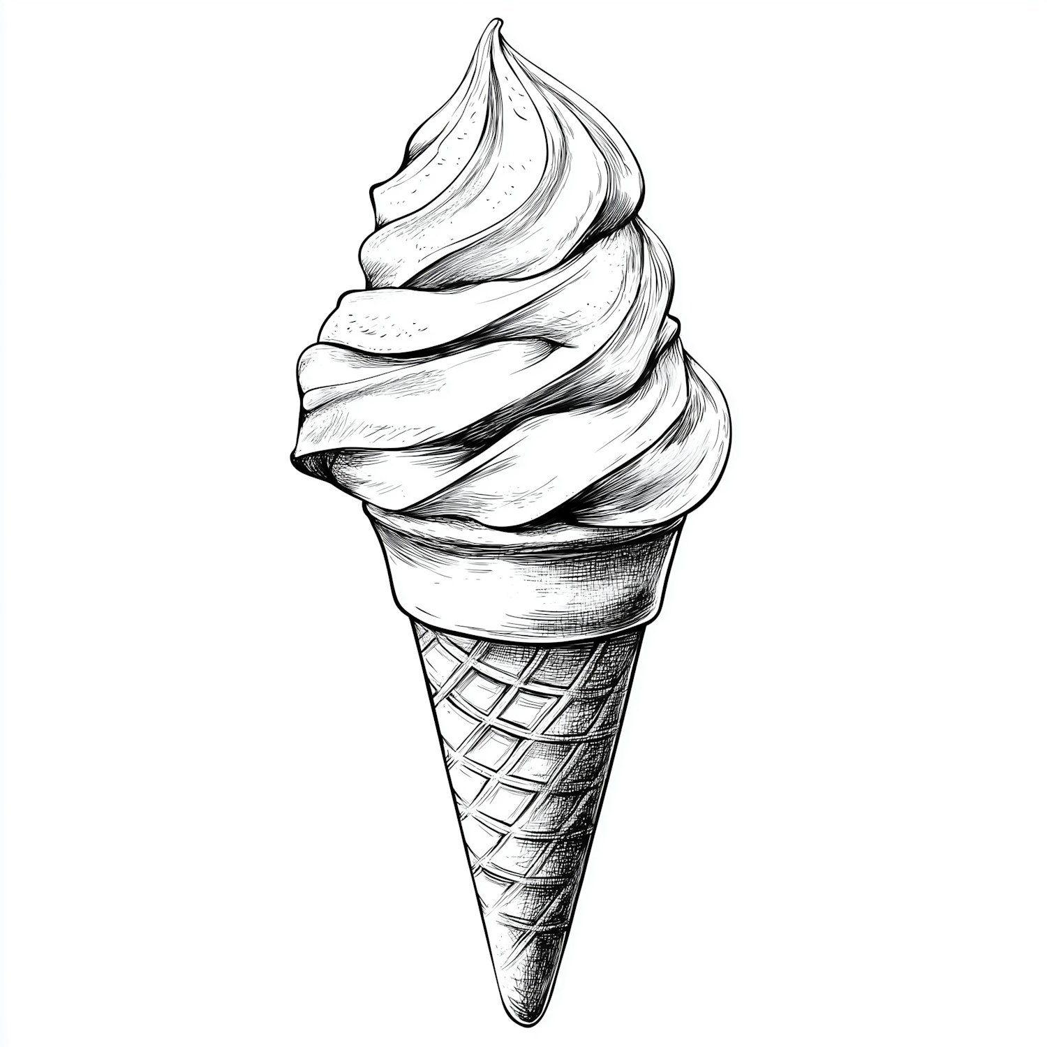 Detailed black-and-white illustration of a soft-serve ice cream cone with intricate shading and a textured waffle cone.