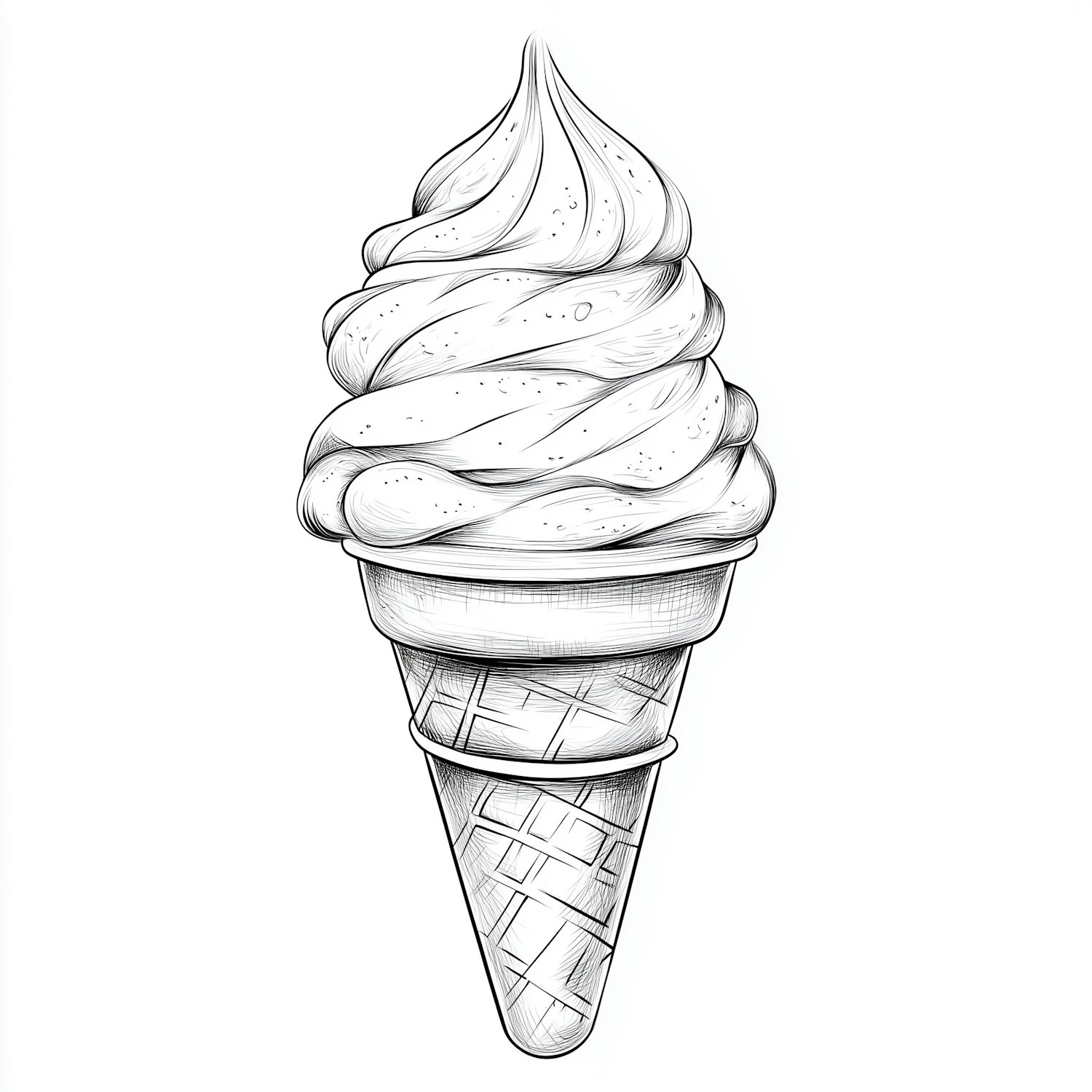 Detailed black-and-white illustration of a soft-serve ice cream cone with intricate shading and a waffle cone design.