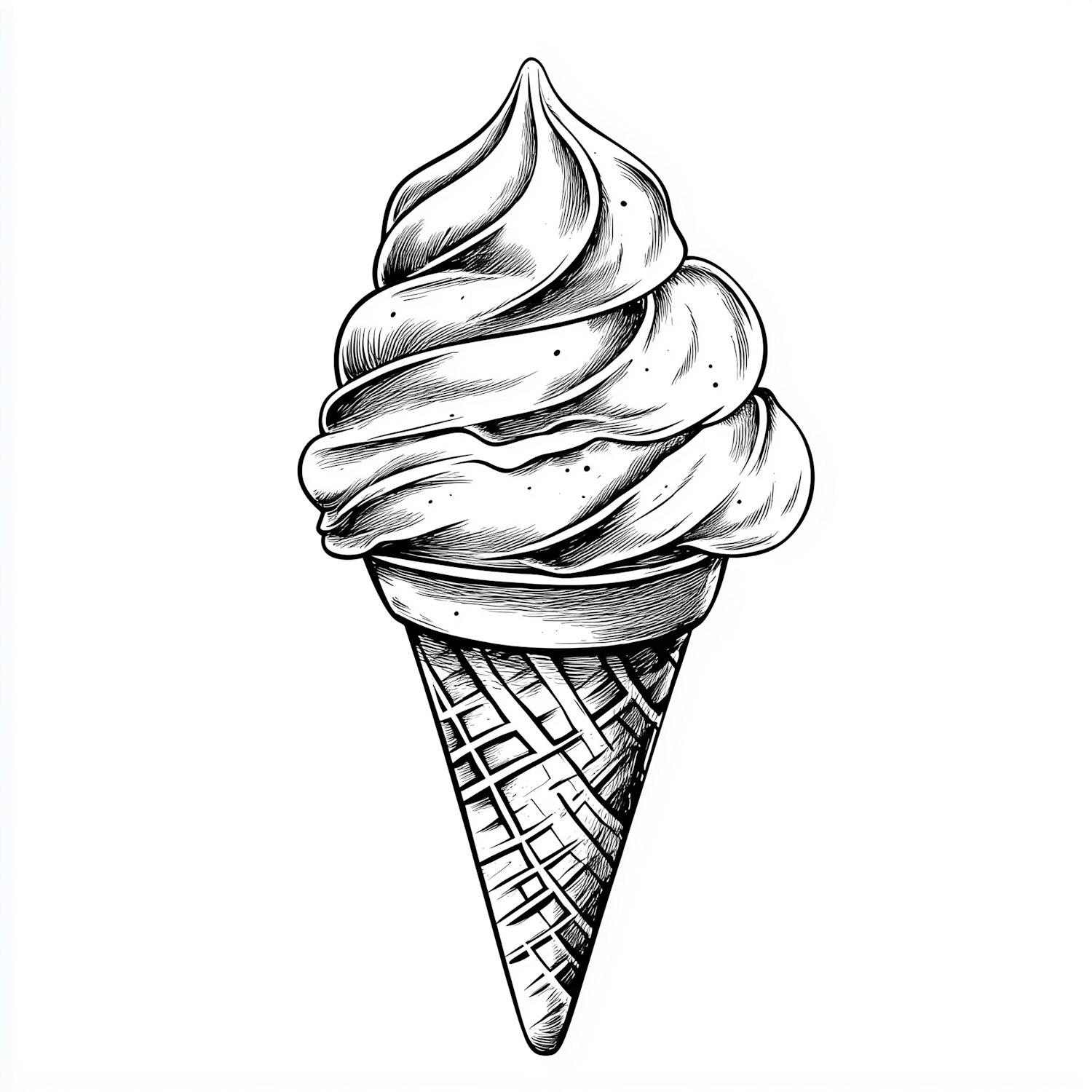 Detailed black-and-white illustration of a soft-serve ice cream cone with intricate shading and a textured cone design.