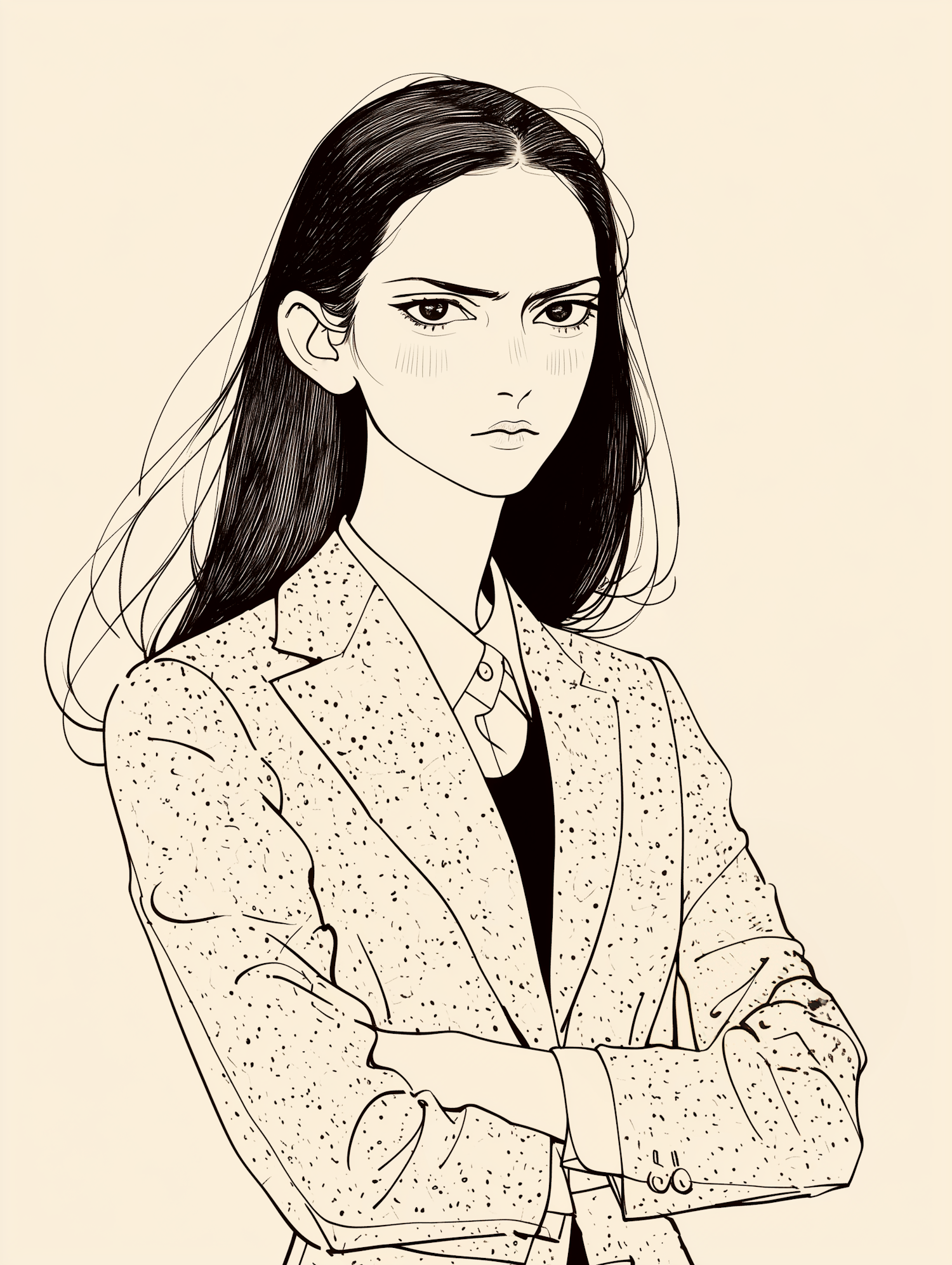 Black and white illustration of a serious young woman in a speckled blazer, arms crossed, conveying determination.