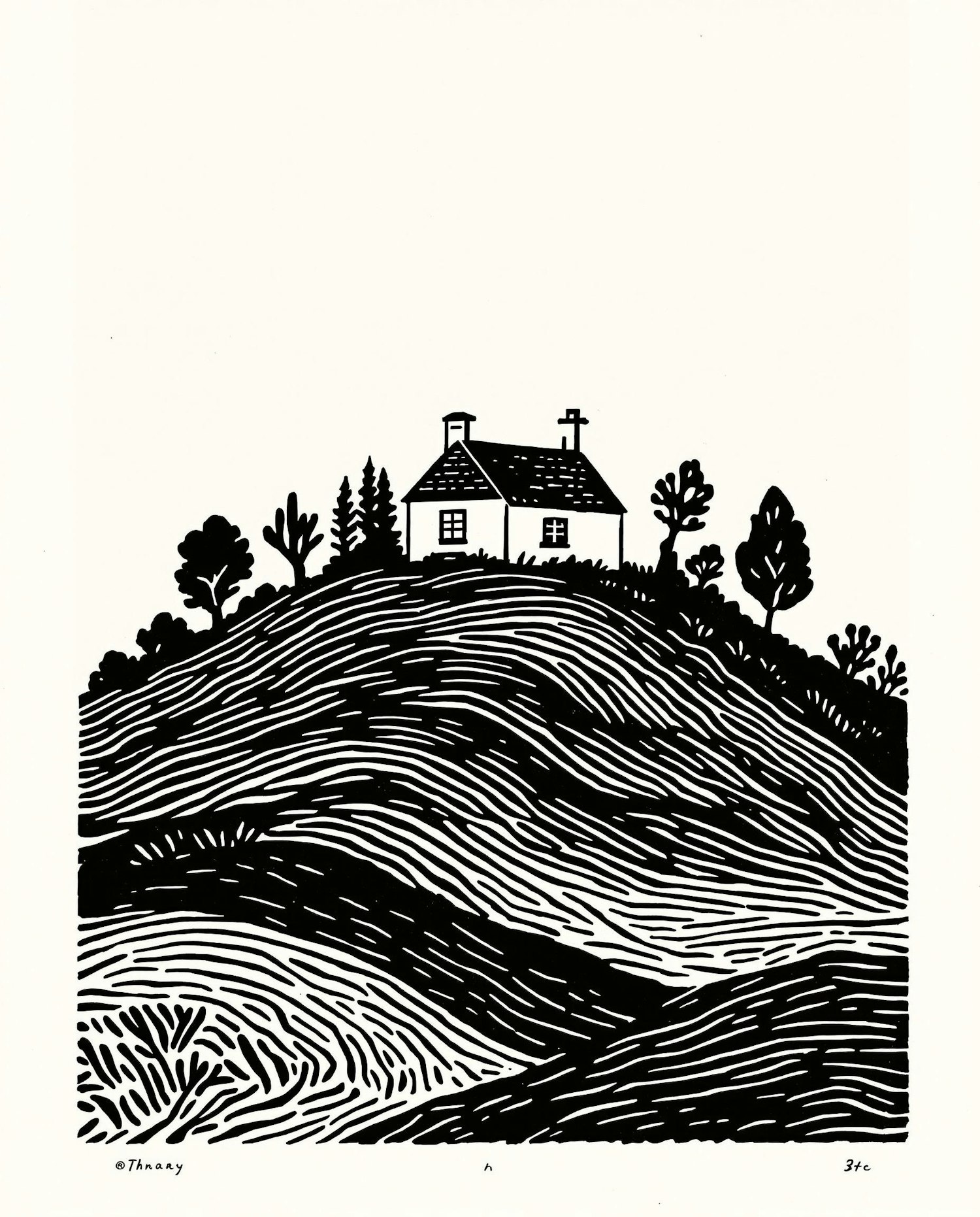 Black and white illustration of a house atop a hill, surrounded by trees, with stylized wavy line details.