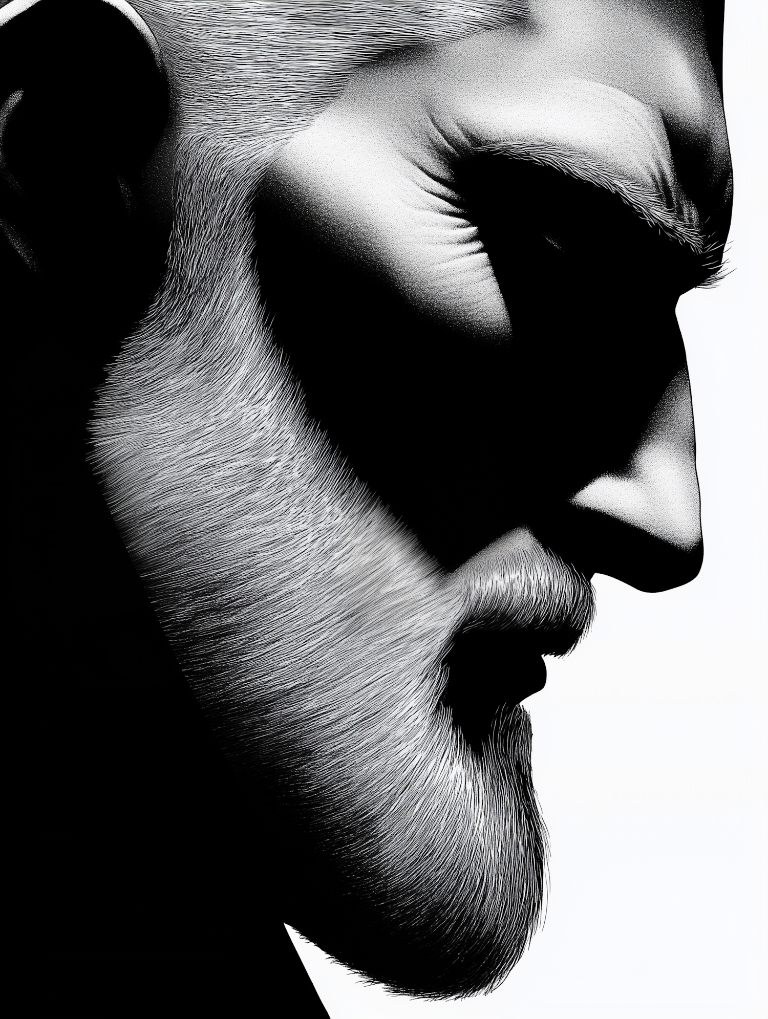 Dramatic black and white illustration of a man's profile with detailed beard and intense expression, highlighting light and shadow play.