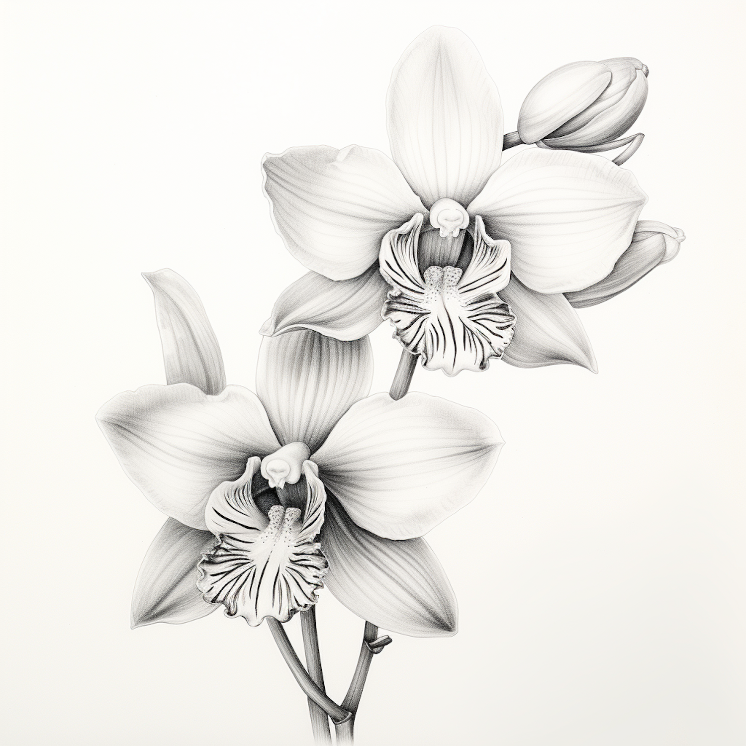 Intricate black and white illustration of orchids with detailed petal textures and shading, creating a realistic and elegant look.