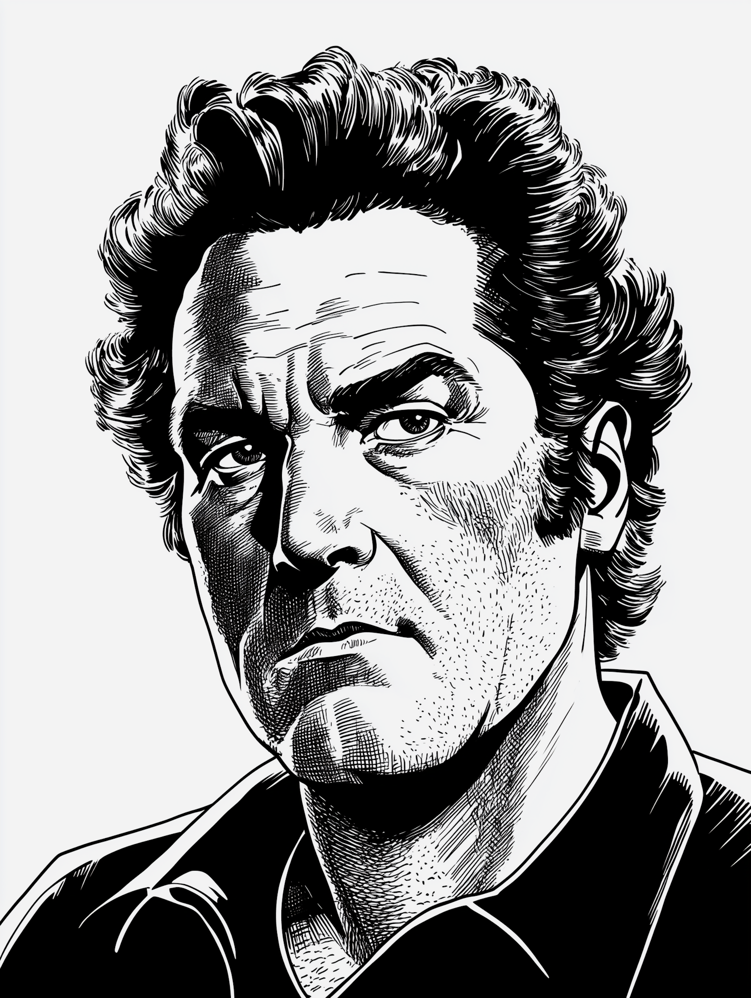 Black and white illustration of a serious man with curly hair and intense eyes, showcasing detailed line work and strong contrast.