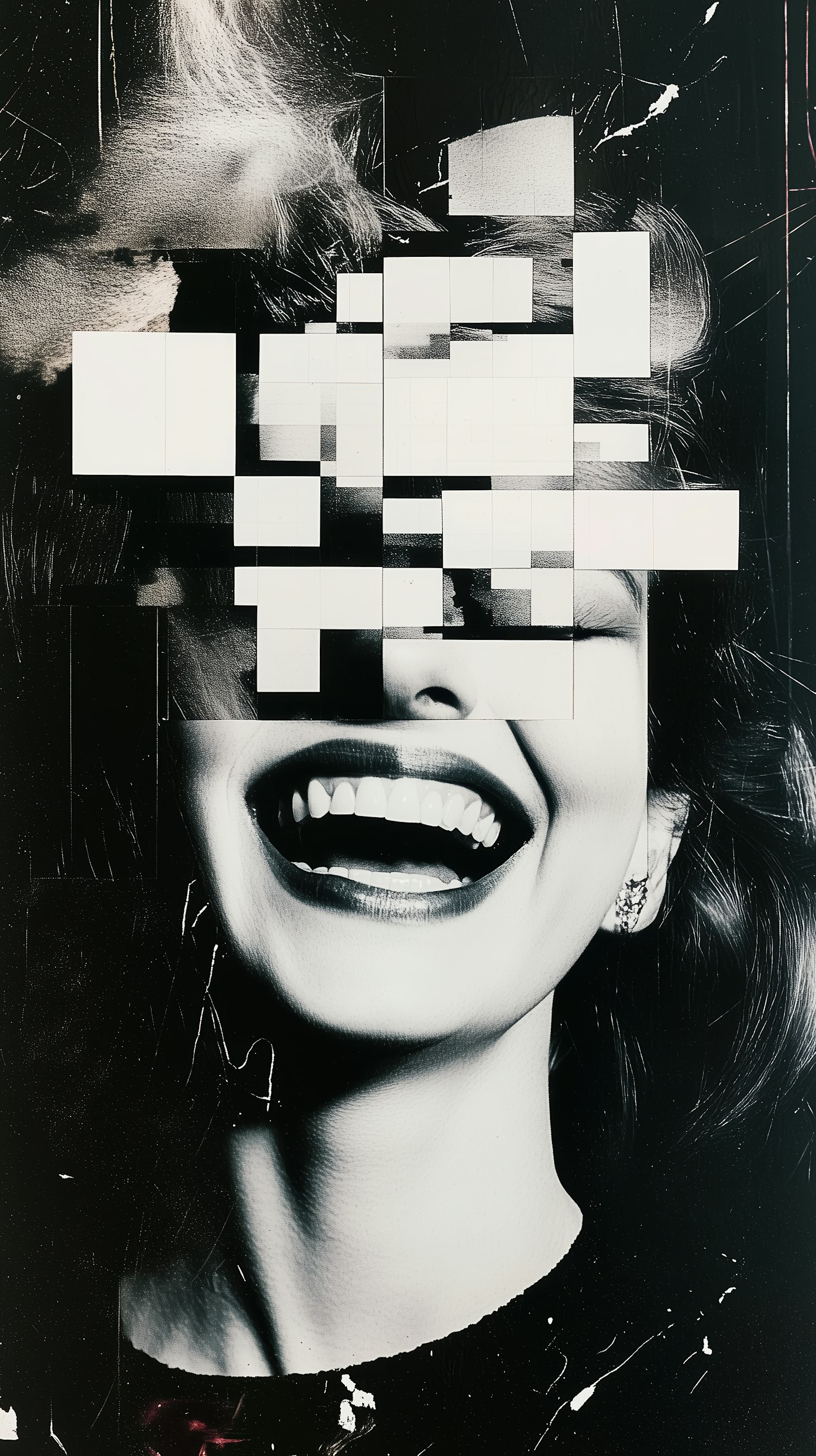 Abstract black and white image of a smiling woman with pixelated blocks obscuring her eyes, blending classic beauty with modern art.