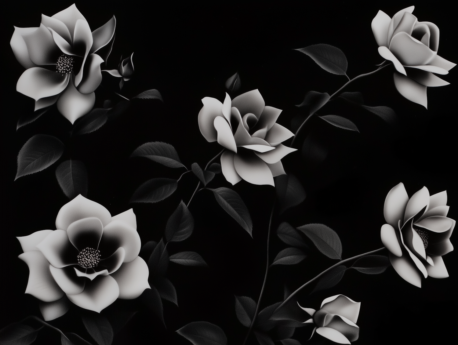Elegant black-and-white illustration of roses with intricate details and a dramatic dark background. Perfect for floral art lovers.