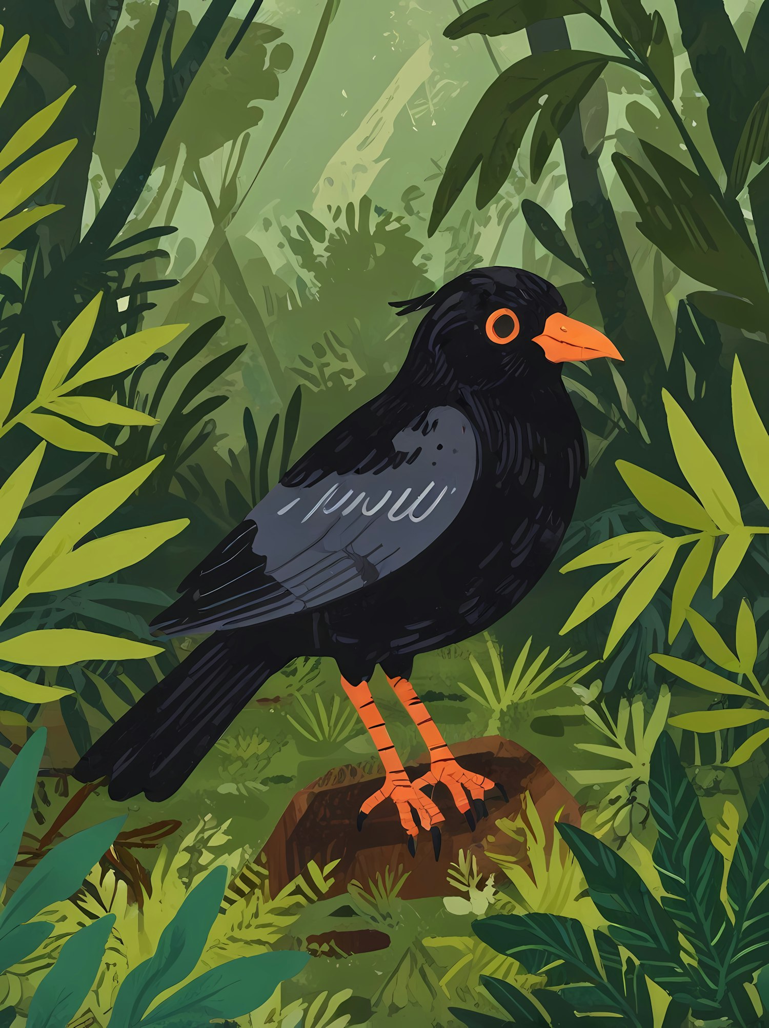 Illustration of a black bird with orange beak and legs in a lush green jungle, surrounded by vibrant foliage and natural details.