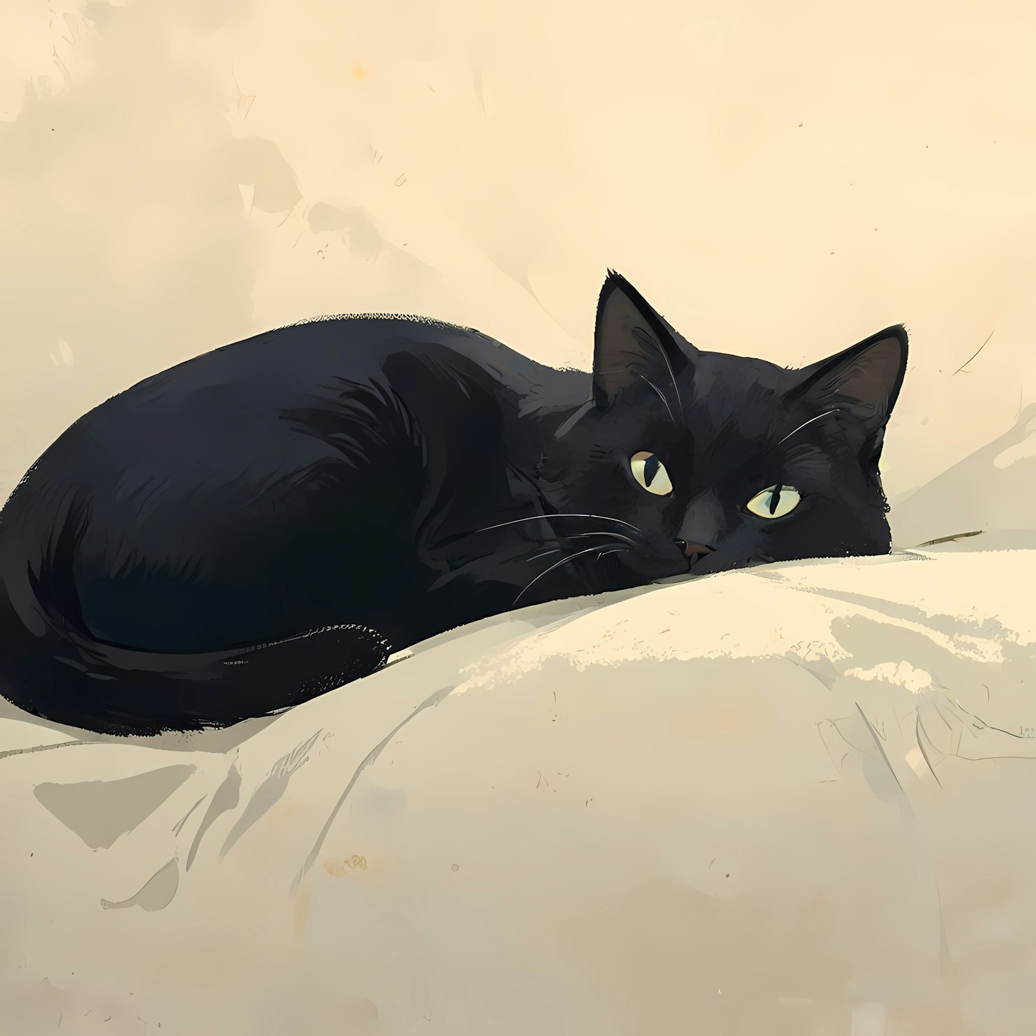 Illustration of a black cat with green eyes resting on a light surface, exuding calmness and warmth.