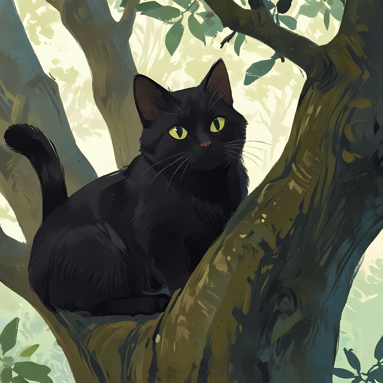 A black cat with green eyes perched on a tree branch in a sunlit forest setting, surrounded by leaves and branches.