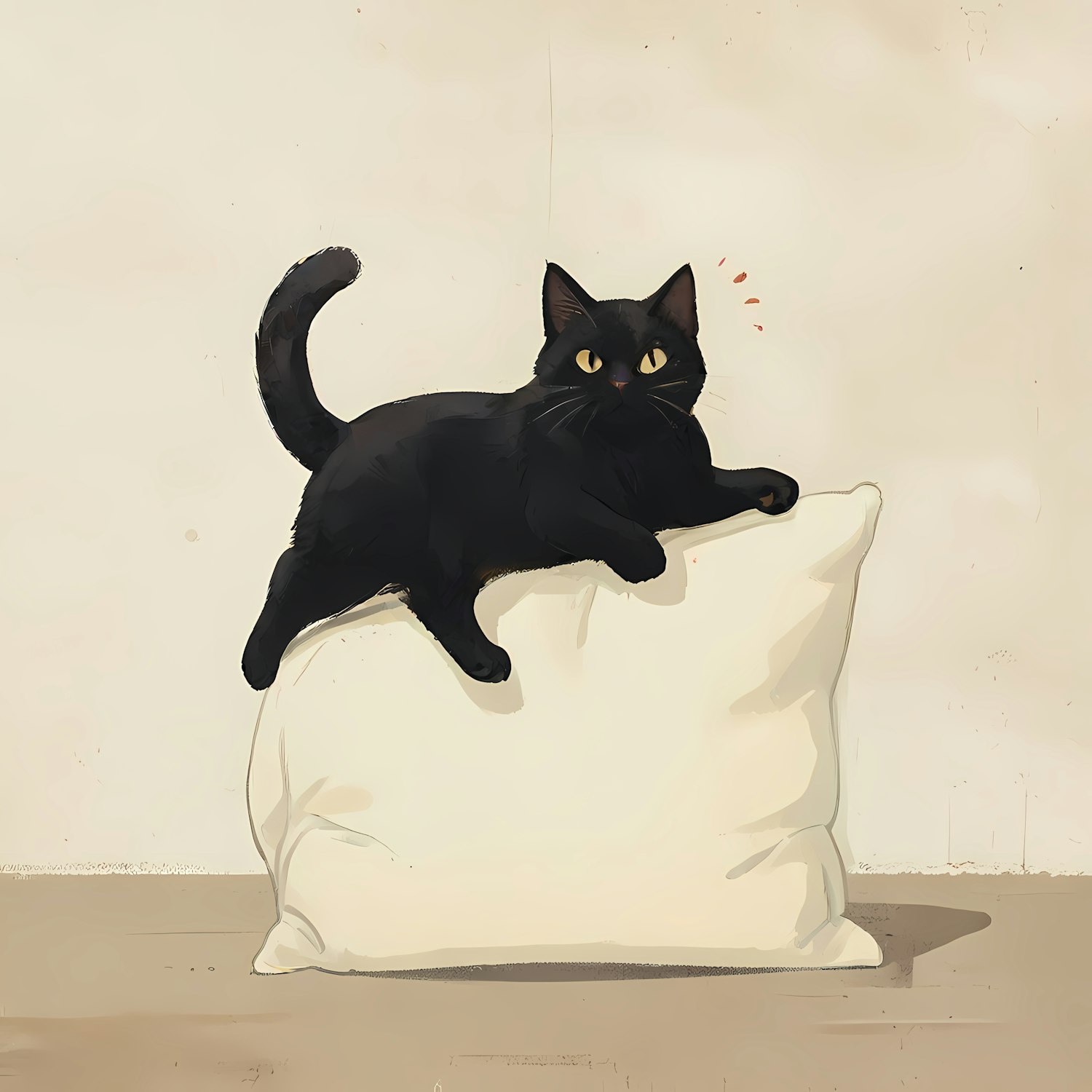 A black cat with yellow eyes relaxes on a white pillow against a beige background, creating a cozy and serene scene.
