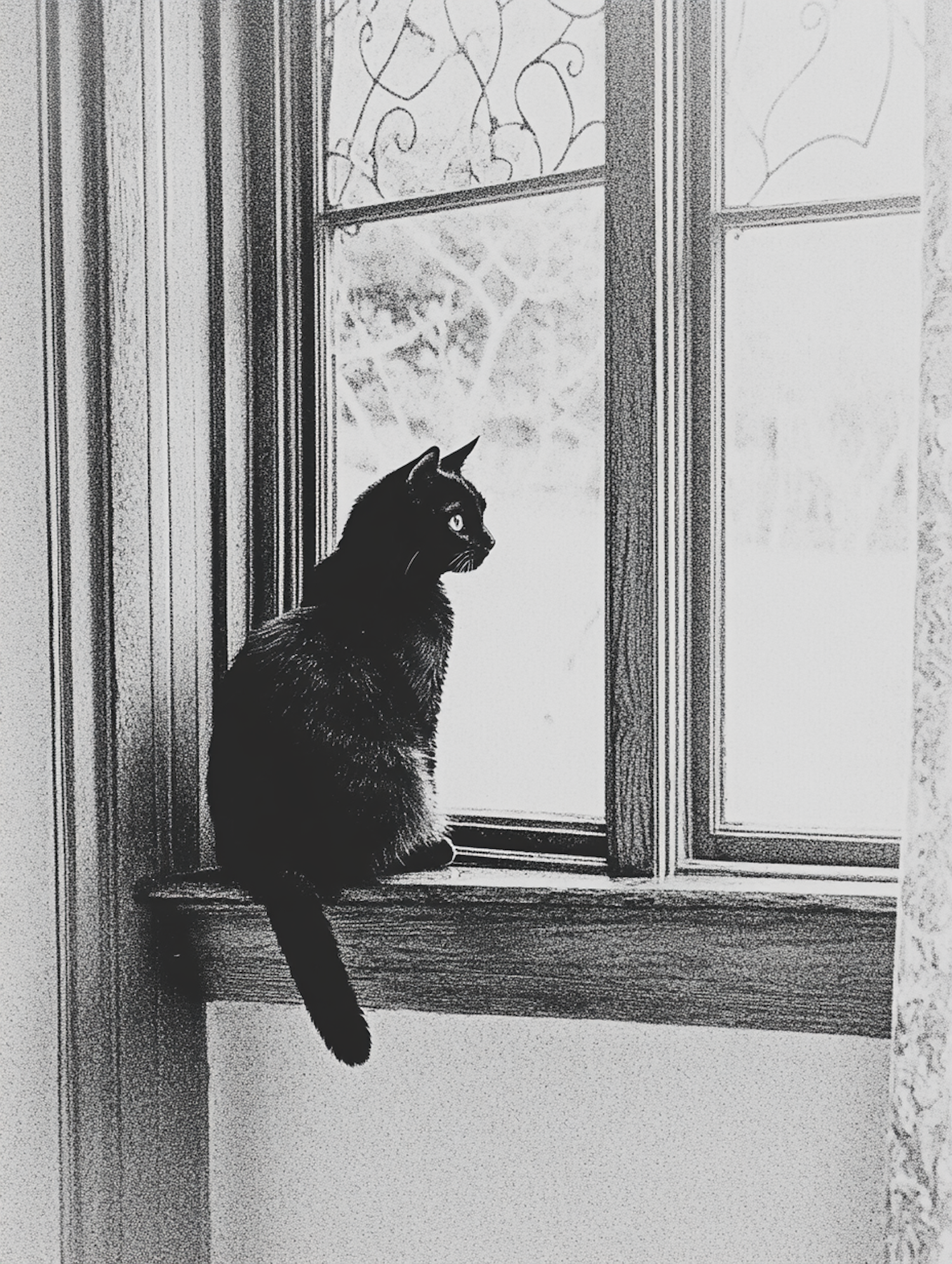 A black cat sits on a windowsill, gazing outside through a vintage-style window with intricate patterns. Moody black-and-white aesthetic.