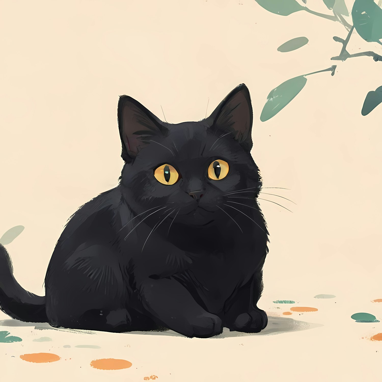 Illustration of a black cat with yellow eyes on a light background, featuring abstract color splashes and a leafy branch.