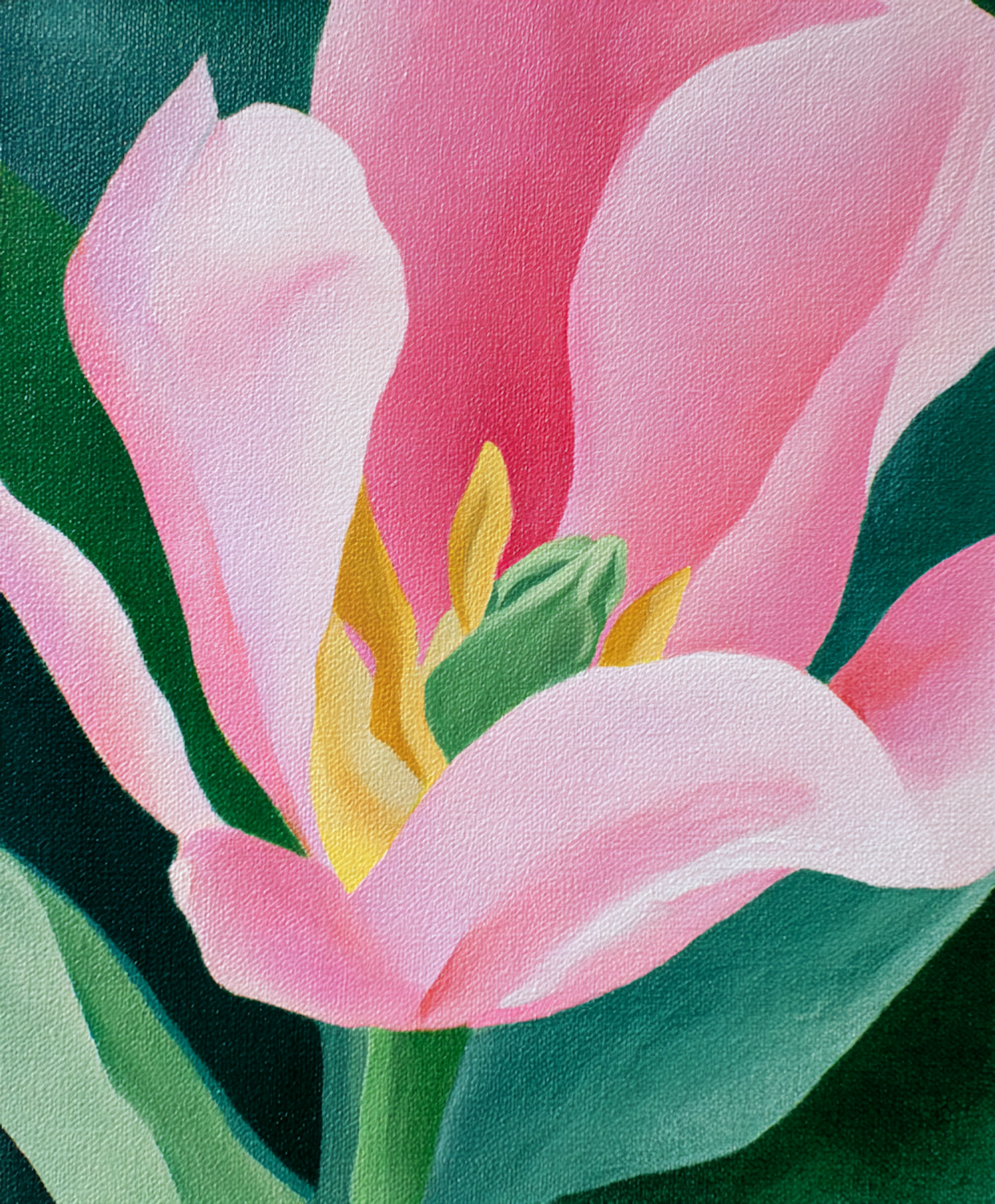 A vivid painting of a pink flower surrounded by green leaves, showcasing soft textures and delicate details on canvas.