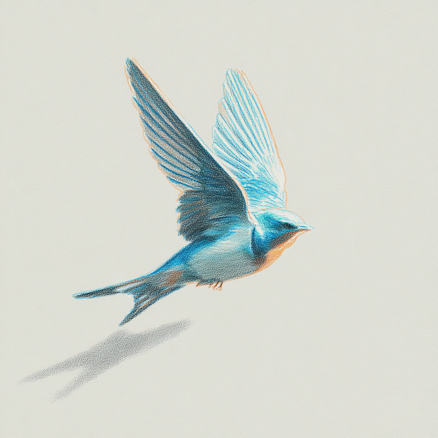 A beautiful pastel-style illustration of a blue bird in flight, with detailed wings and a soft beige background.