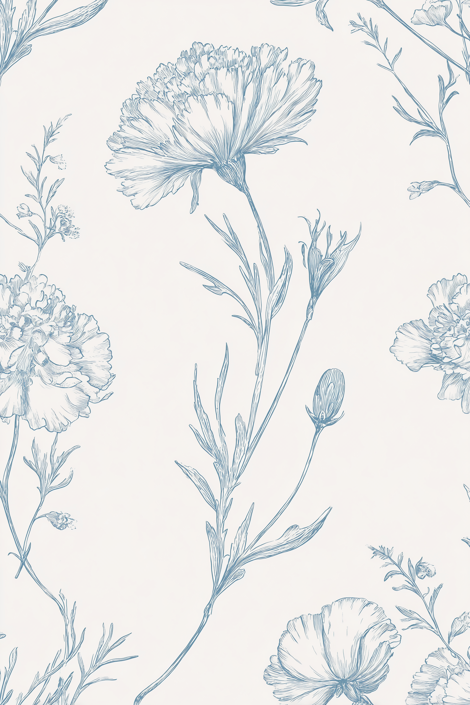 Delicate blue line art floral pattern on a light background, perfect for elegant wallpaper or fabric designs.