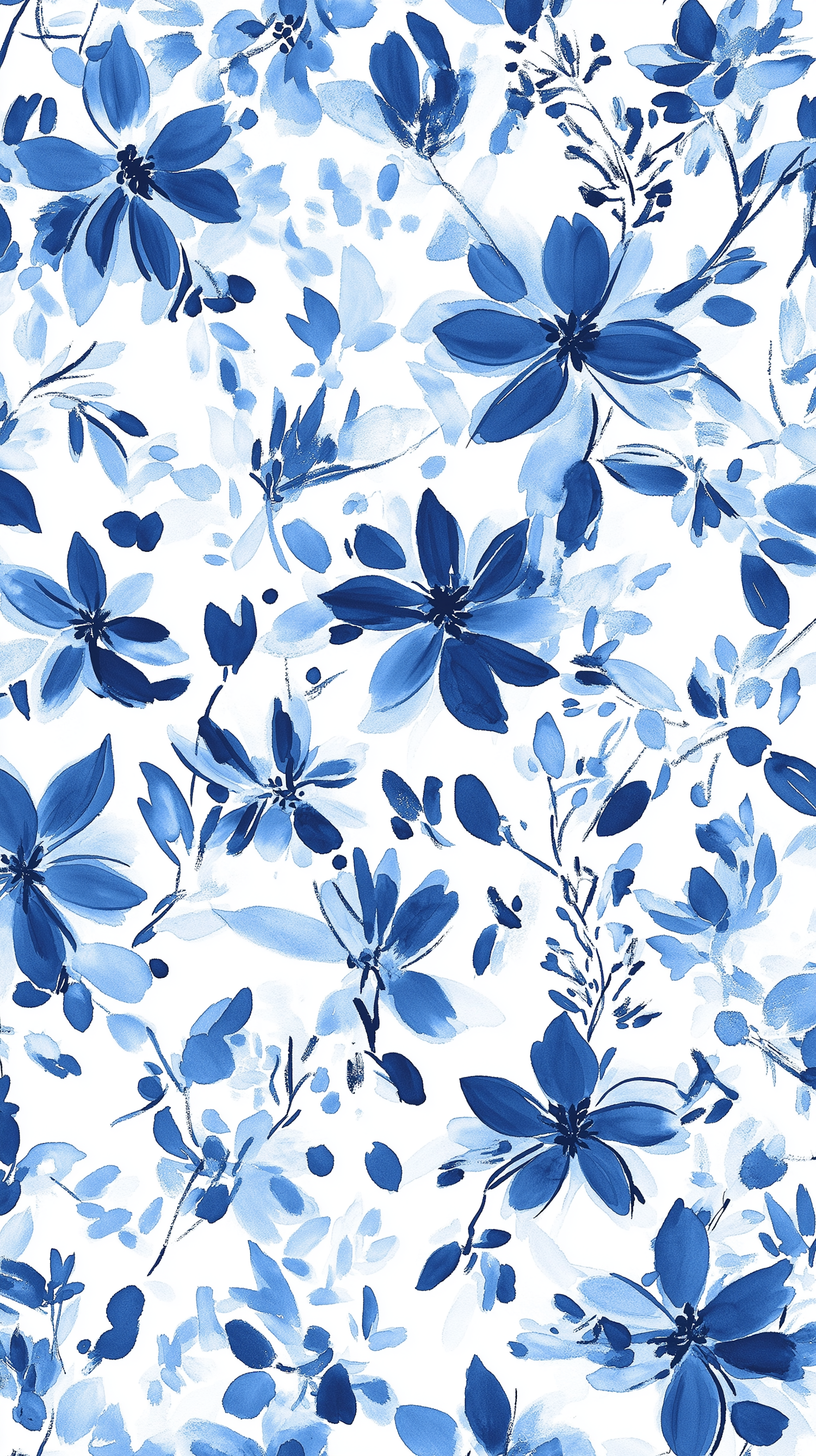 Elegant blue floral watercolor pattern on white background, featuring large flowers and delicate leaves in soft brushstrokes.
