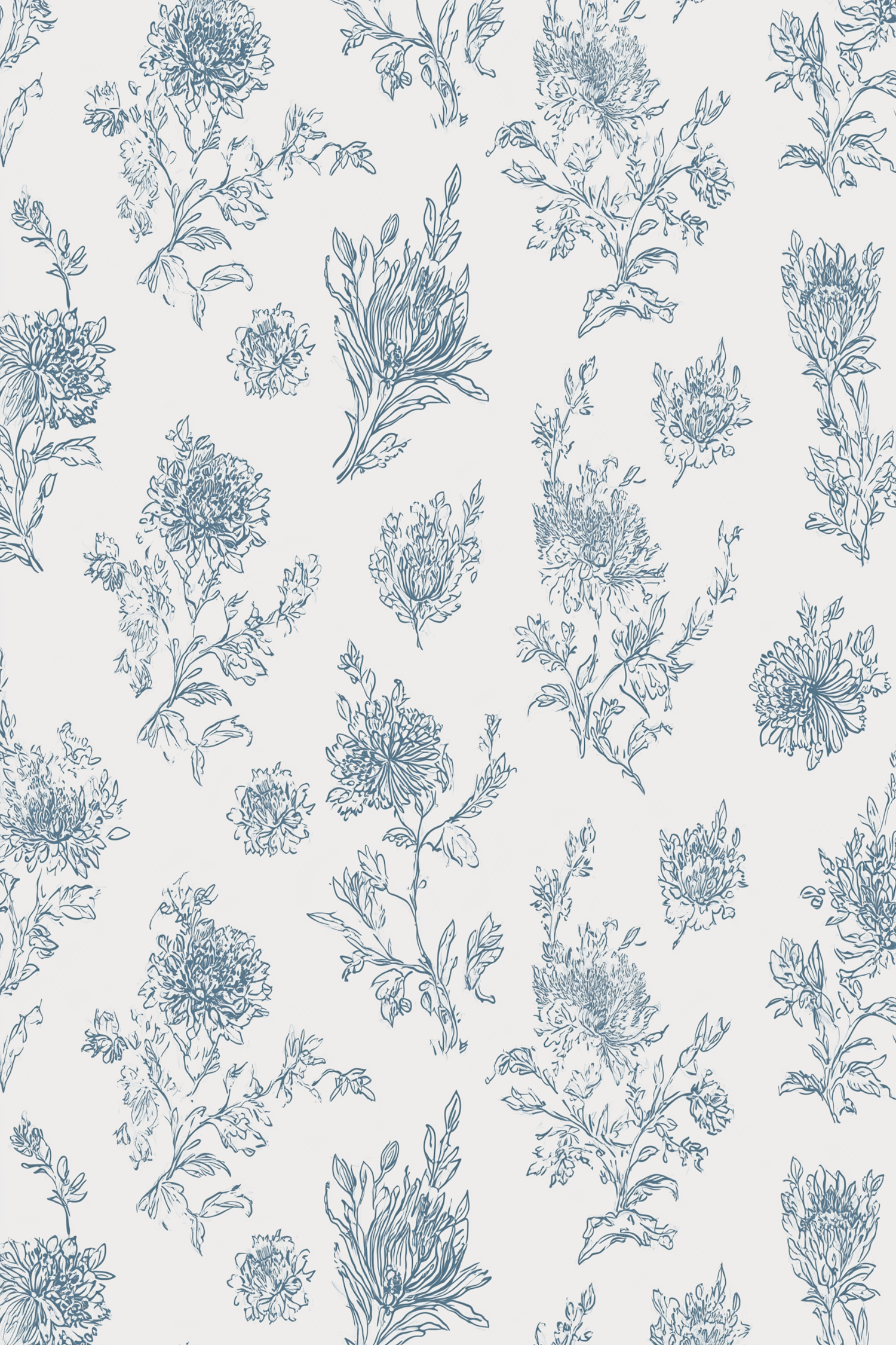 Elegant blue floral line art on a white background, perfect for wallpaper or fabric designs with a classic and timeless aesthetic.