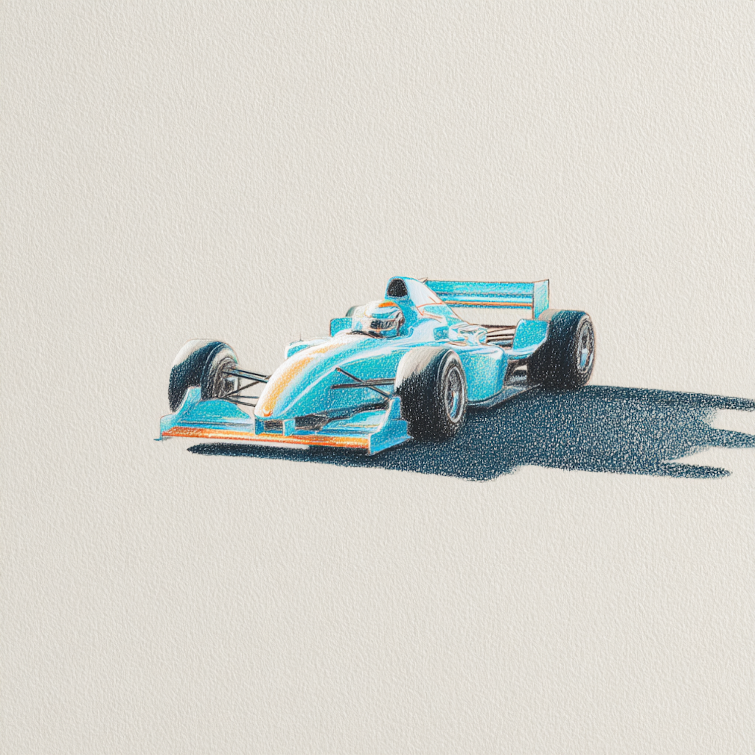 Stylized illustration of a blue and orange Formula 1 car on a textured background, highlighting its sleek design and vibrant colors.
