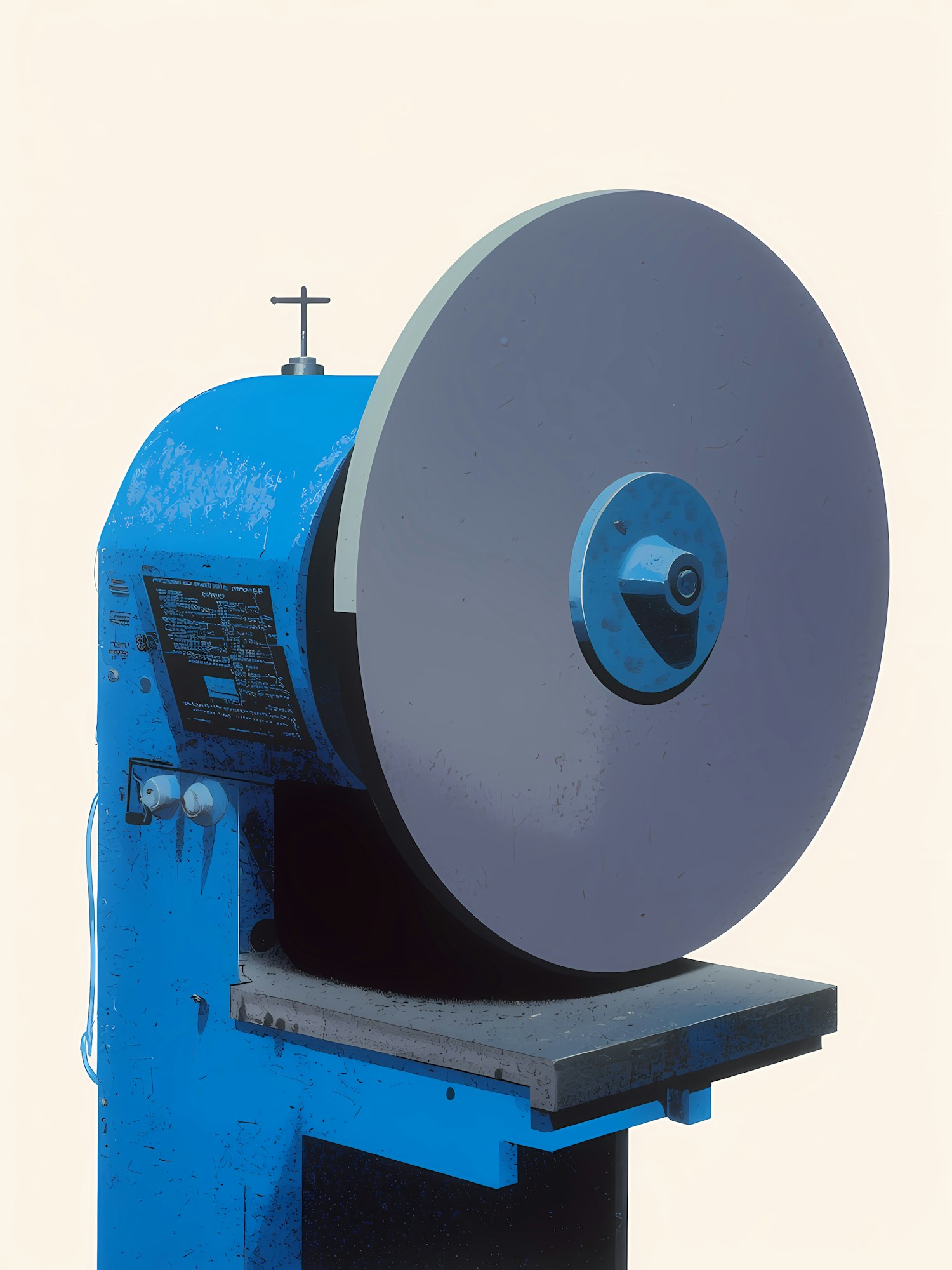 A blue industrial grinding machine with a large circular wheel, set against a plain beige background, showcasing its detailed design.