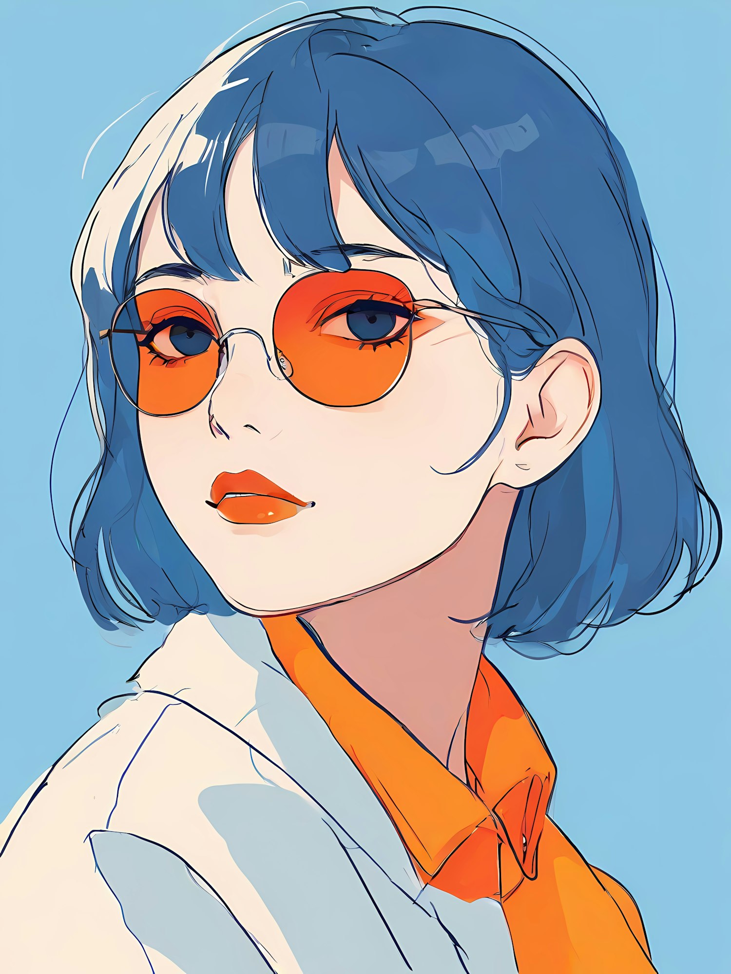 Stylish illustration of a woman with blue hair, orange sunglasses, and a bold orange outfit against a light blue background.