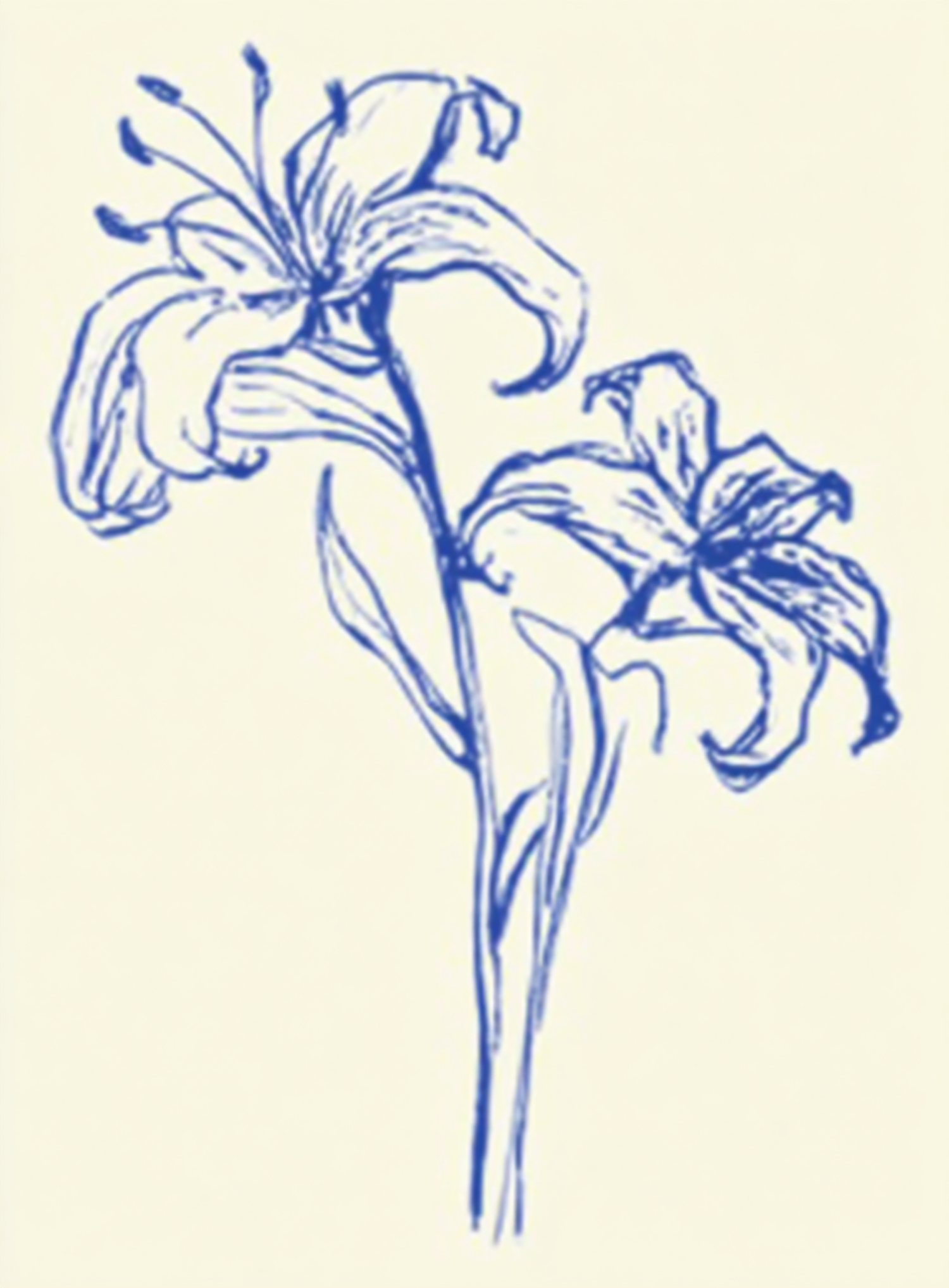 A minimalist blue ink drawing of two lilies on a light background, showcasing their elegant petals and stems in intricate detail.