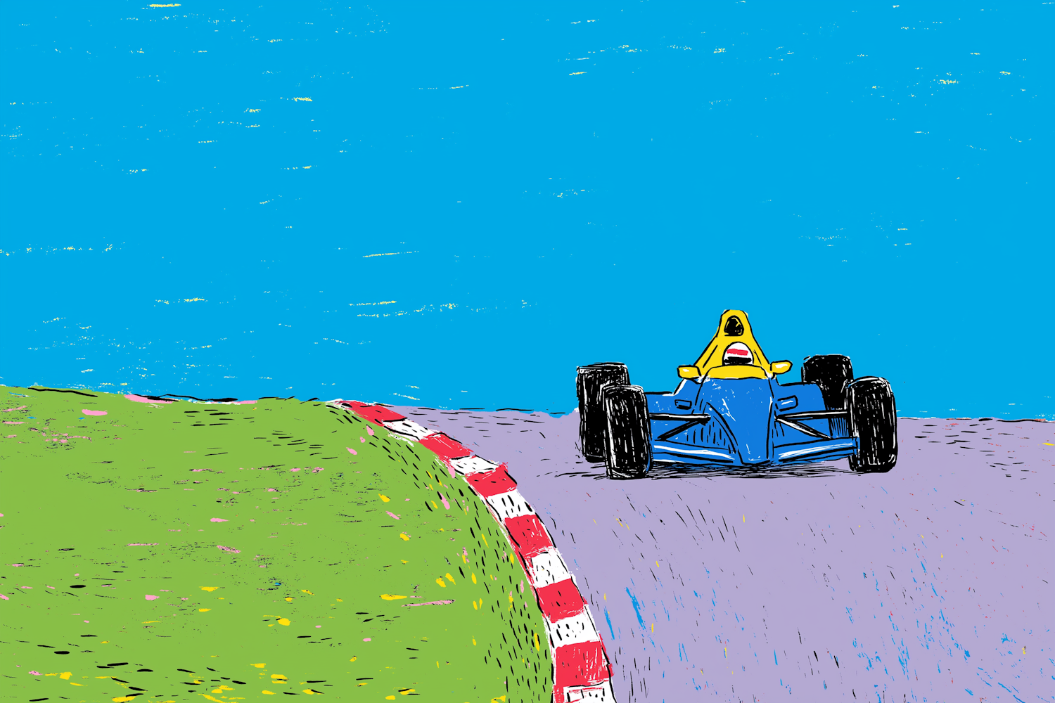 Stylized illustration of a blue race car on a track with a vibrant sky and grassy surroundings, emphasizing speed and motion.