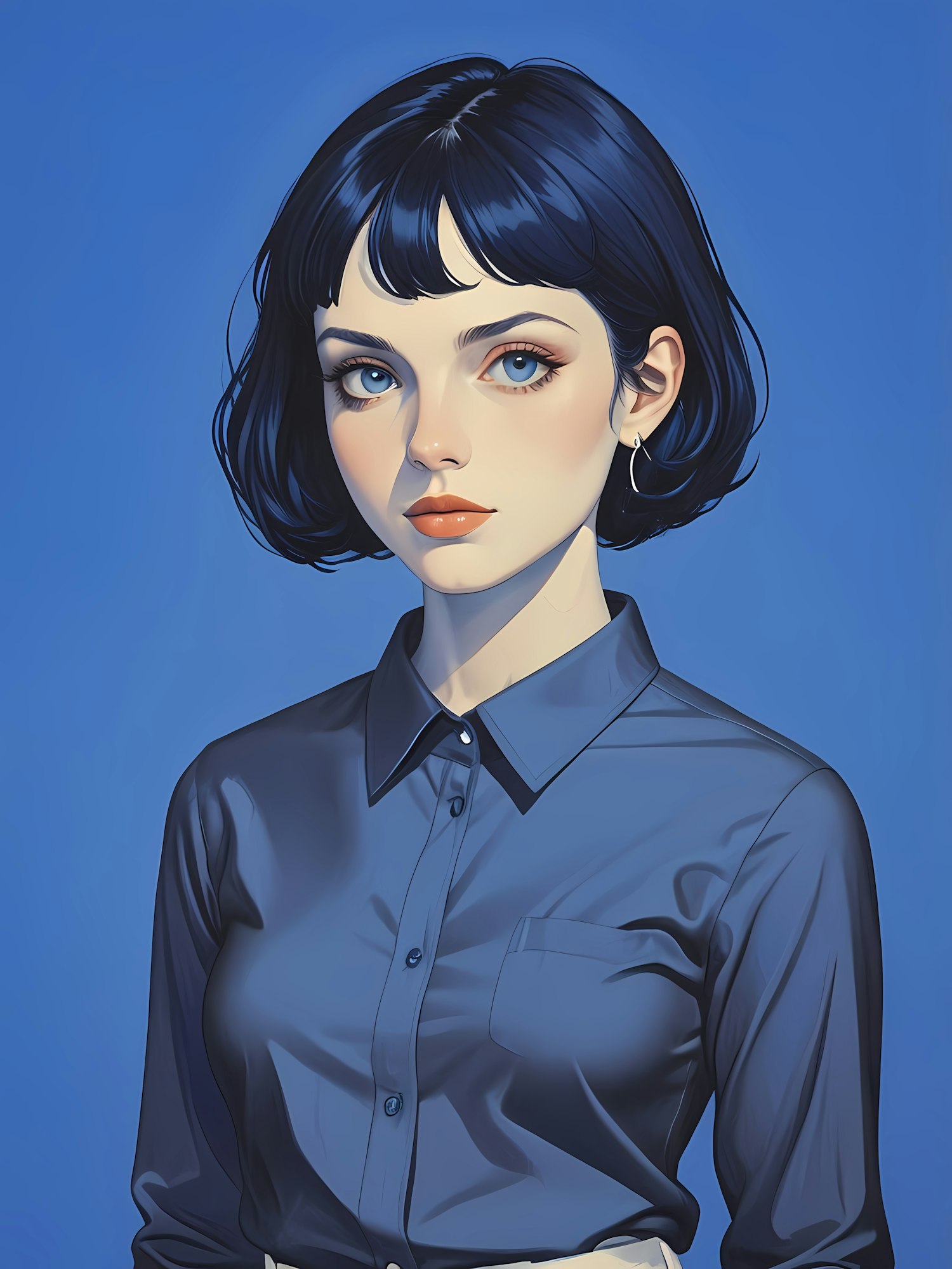 Illustration of a young woman with short dark blue hair and blue eyes, wearing a blue shirt against a blue background.