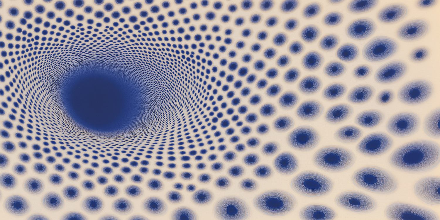 Hypnotic optical illusion with blue dots on beige, creating a spiral tunnel effect. Captivating depth and movement in a dynamic pattern.