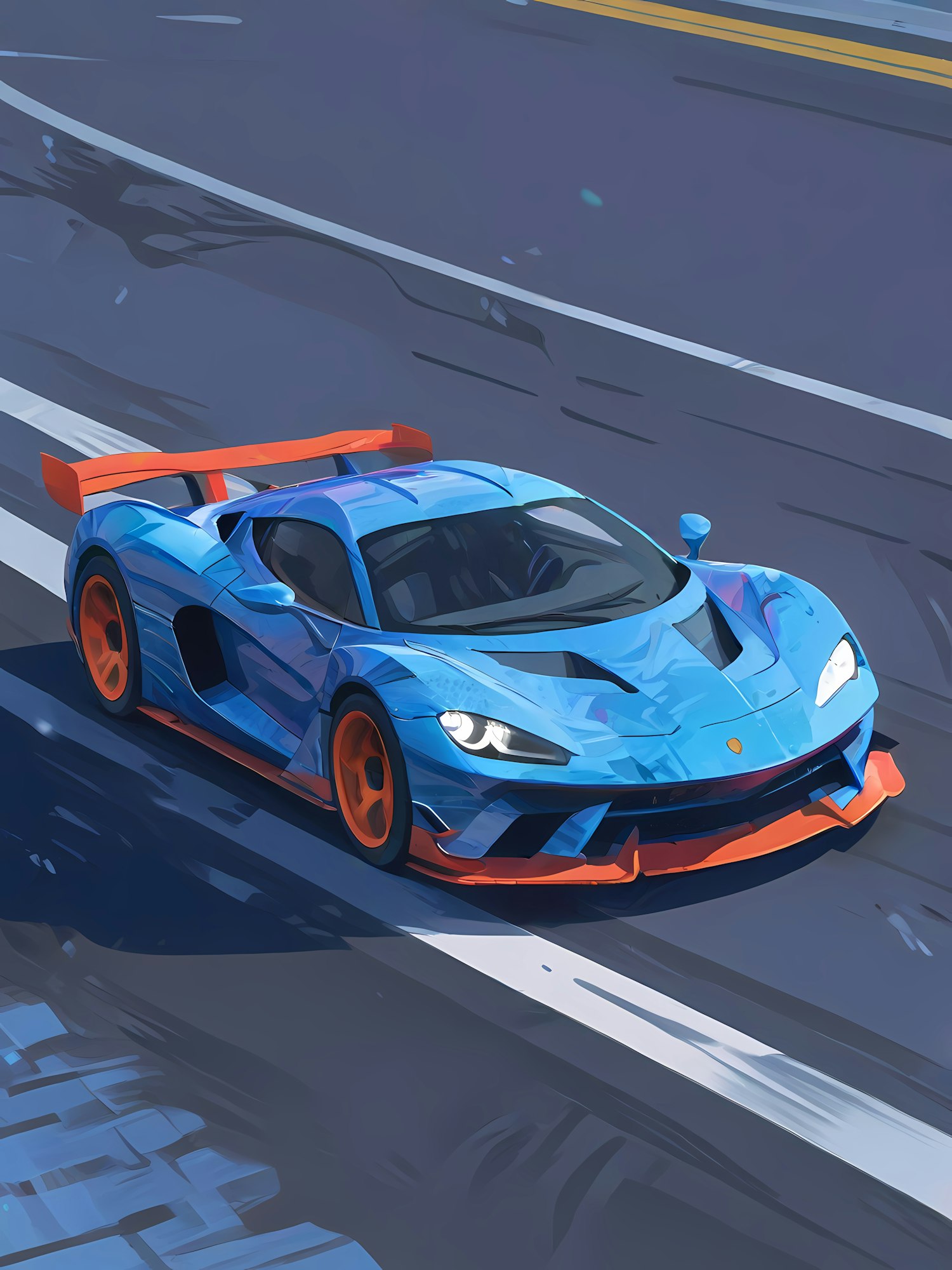 Stylized illustration of a blue sports car with orange accents speeding on a road, showcasing sleek design and dynamic motion.